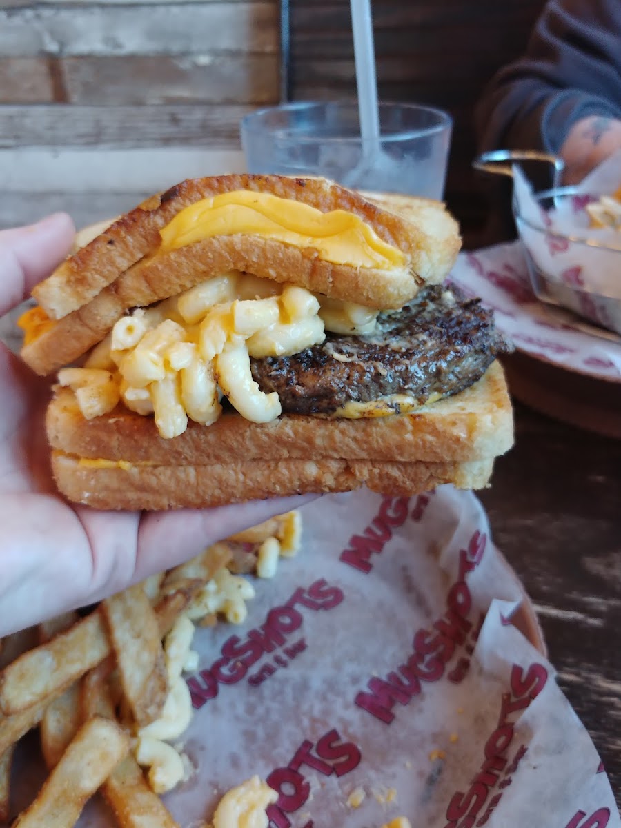 Mugshots Grill And Bar - Tupelo, Ms is a hamburger restaurant found at 374 E Main St, Tupelo, MS 38804, United States. It has attracted 1927 reviews. Mugshots is best known for dishes like The Texan Burger, Mac N Cheese Burger and Fries, Bacon Guacamole Burger, Blackened Mahi Salad, and the Mac and Cheese Burger. Peak busy hours occur on Saturday from 4:30 PM to 9:00 PM and Sunday from 2:30 PM to 8:30 PM, with wait times up to 15 minutes. The restaurant tends to have no wait on other days.