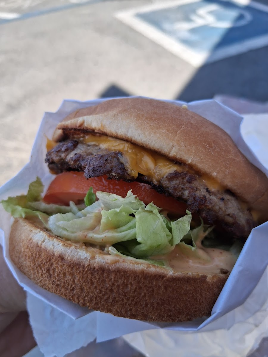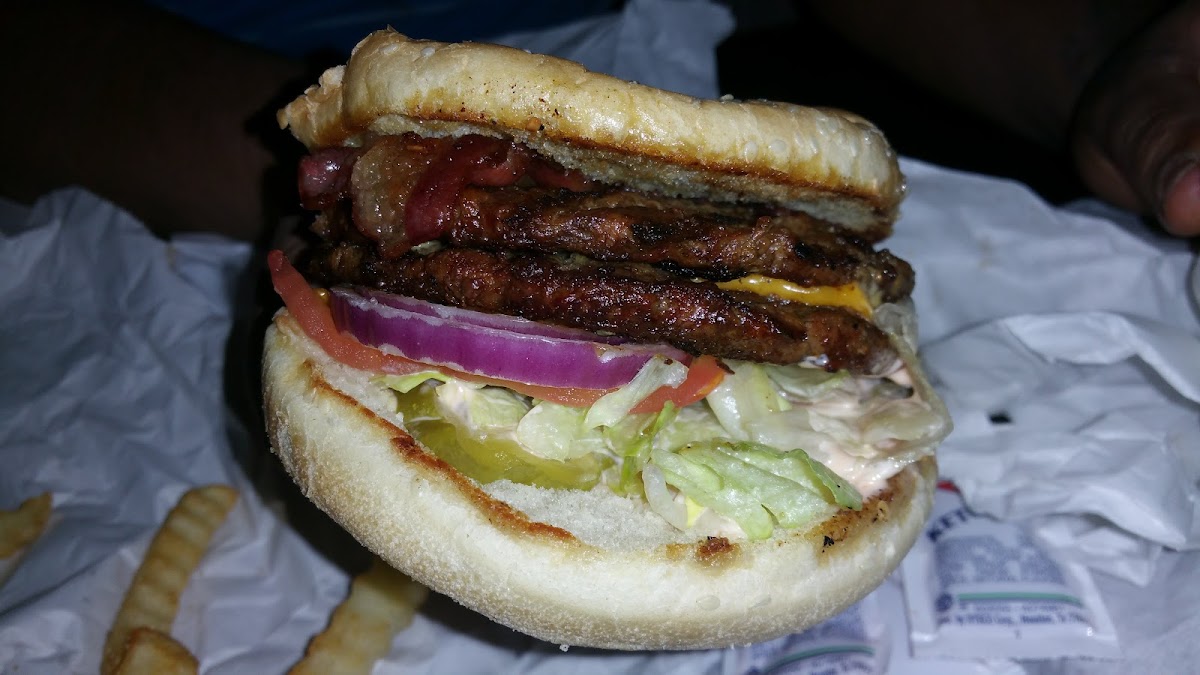 Good juicy burgers. The burgers were a good portion and reasonable pricing. I chose the avocado burger and loved it. Slightly overwhelming amount of selection but definitely a great choice for a weary traveler. It's a drive through mainly location that has very little sitting. The seating is minimal and sits facing the exhaust of most cars in the drive-thru. Bathroom needs a little work but overall I'd do drive thru again, but I wouldnt sit down and eat.