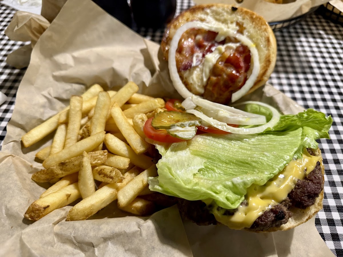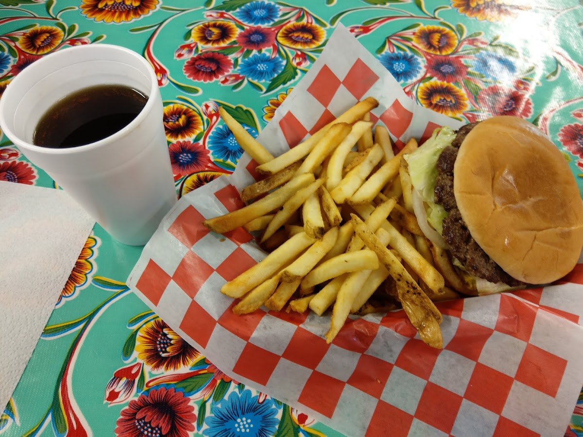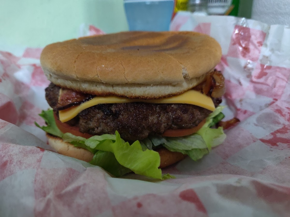 Straight up good place. Burger is excellent with great service. They are very fast there's plenty of places to sit inside there's a huge picnic table outside and I think you could even sit on their front porch. They are very trusting you place your order You sit down with self-serve drinks when it's all done you walk up to the counter tell them what drinks you had and then you pay. Love it