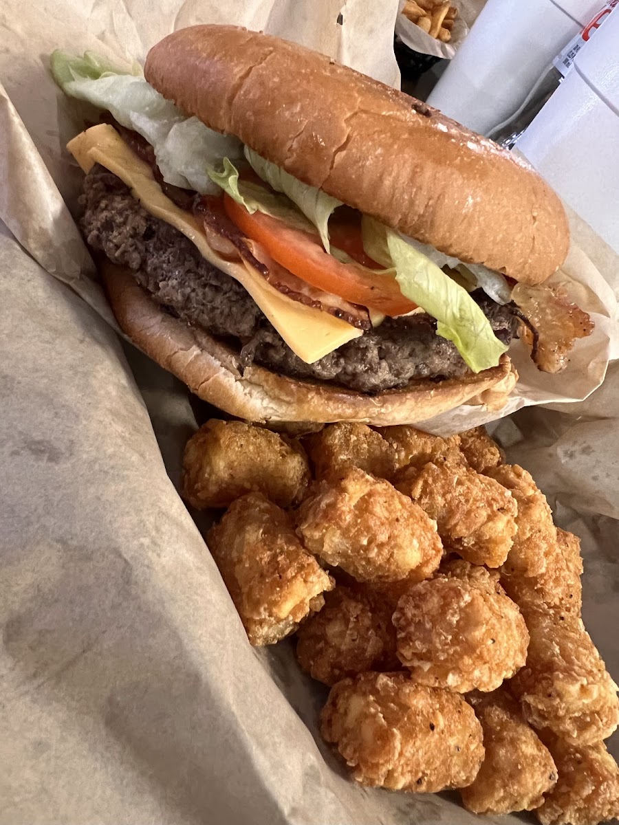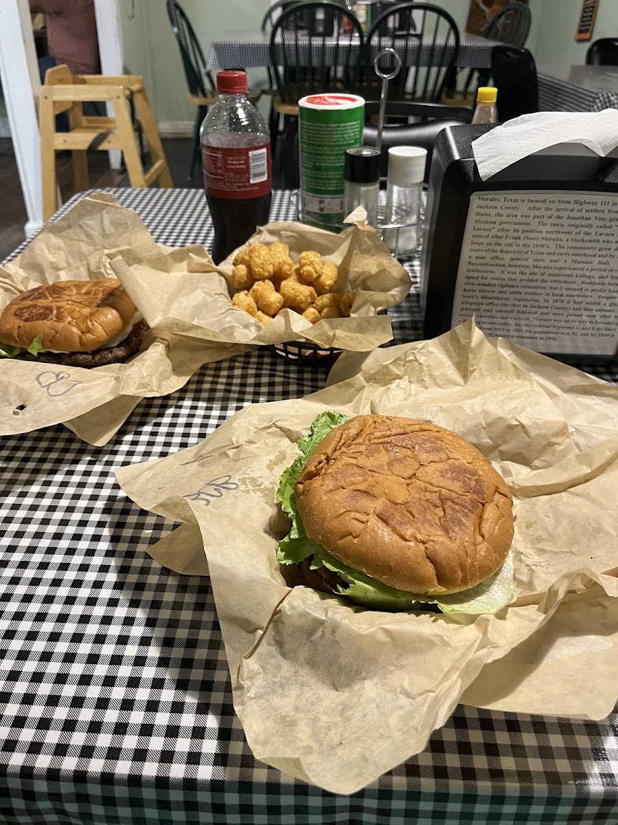 If ya blink, you’ll miss this unassuming store just outside Edna TX heading west on 111. We absolutely love ‘hole in the wall’ places like this. We had heard the burgers are the real deals with large grilled patties and no skimp on fixins. We were not disappointed at all. Have to say in the last few places we’ve tried, this burger is in top 4. Both of us had cheeseburger, but I added bacon and jalapenos to mine. We shared some tots that were crispy but not over done. The lady behind the counter was very polite and I can tell has one of those personalities that is as big as Texas. Definitely will stop when around again.