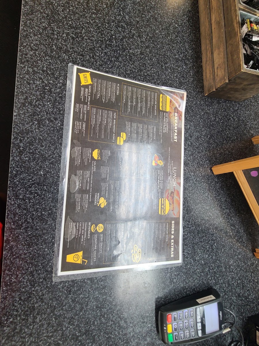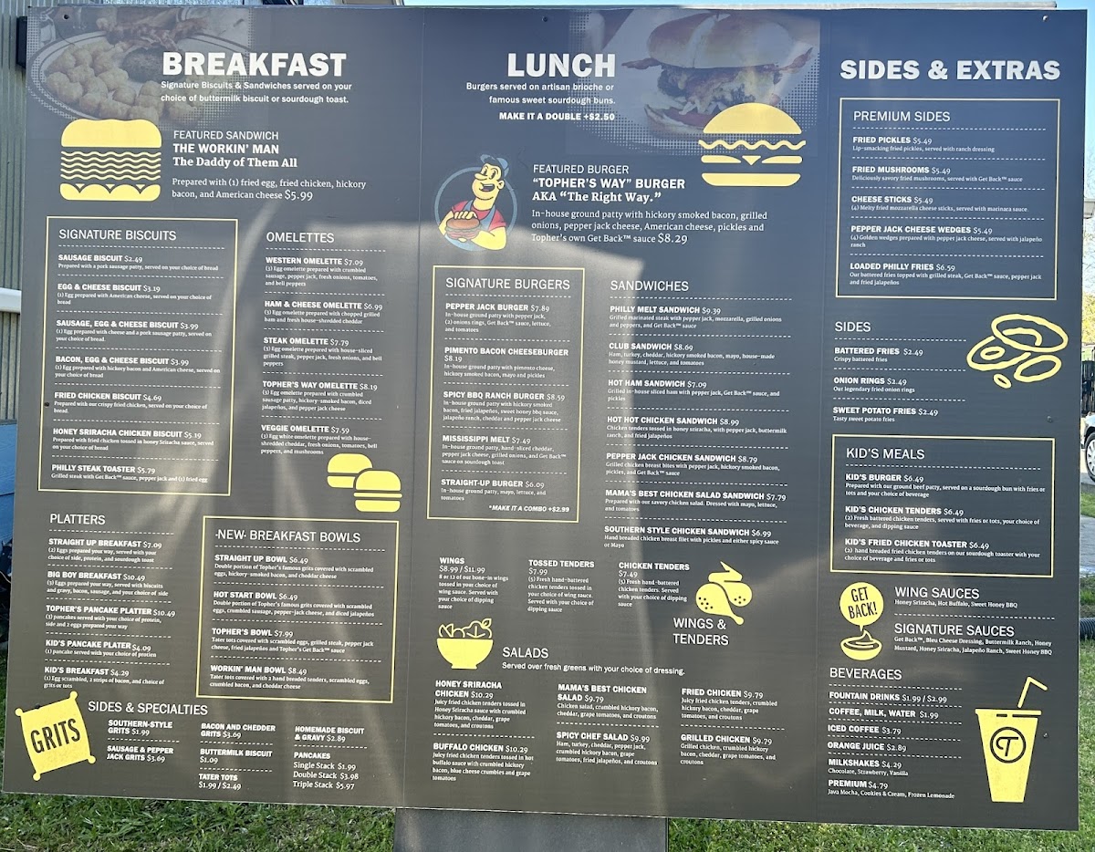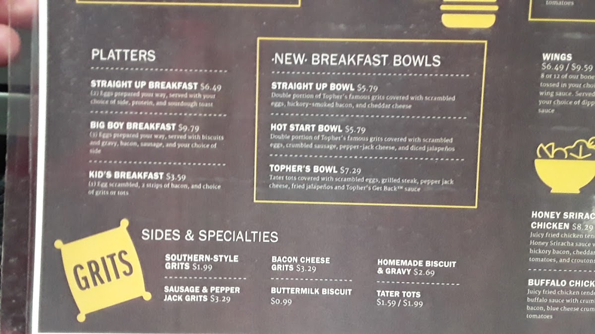 Double portion of topher's famous grits covered with scrambled eggs, meat choice, and cheddar cheese.