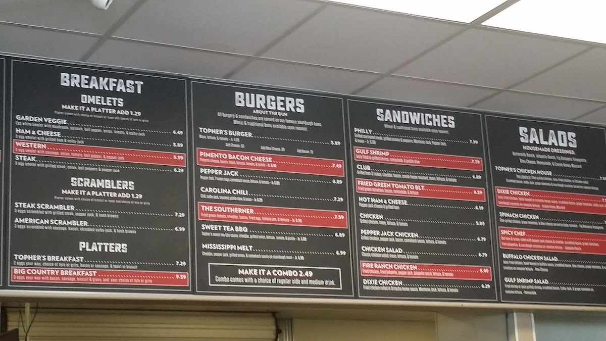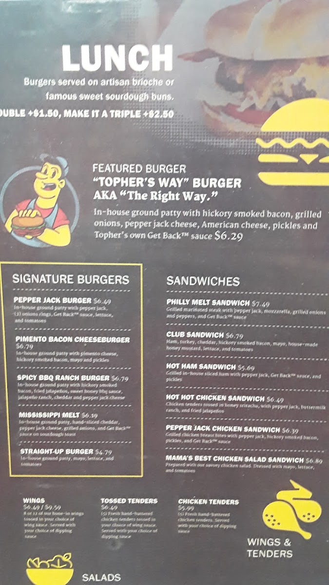 In-house ground patty with hickory smoked bacon, grilled onions, pepper jack cheese, american cheese, pickles, and topher's own get back™ sauce.