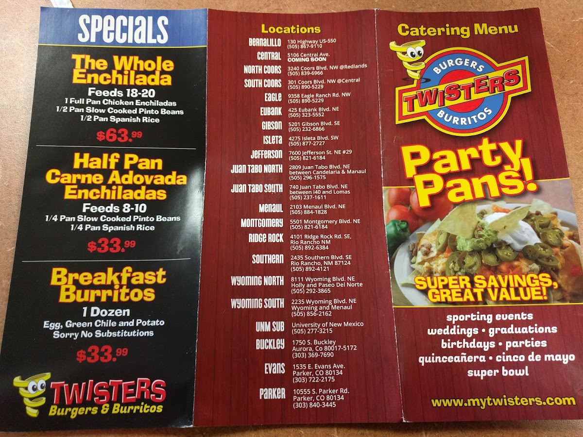 Served with pan fried potatoes, slow cooked pinto beans, 2 eggs of choice, red or green chile, cheese and a side tortilla. 1160-1180 calories.
