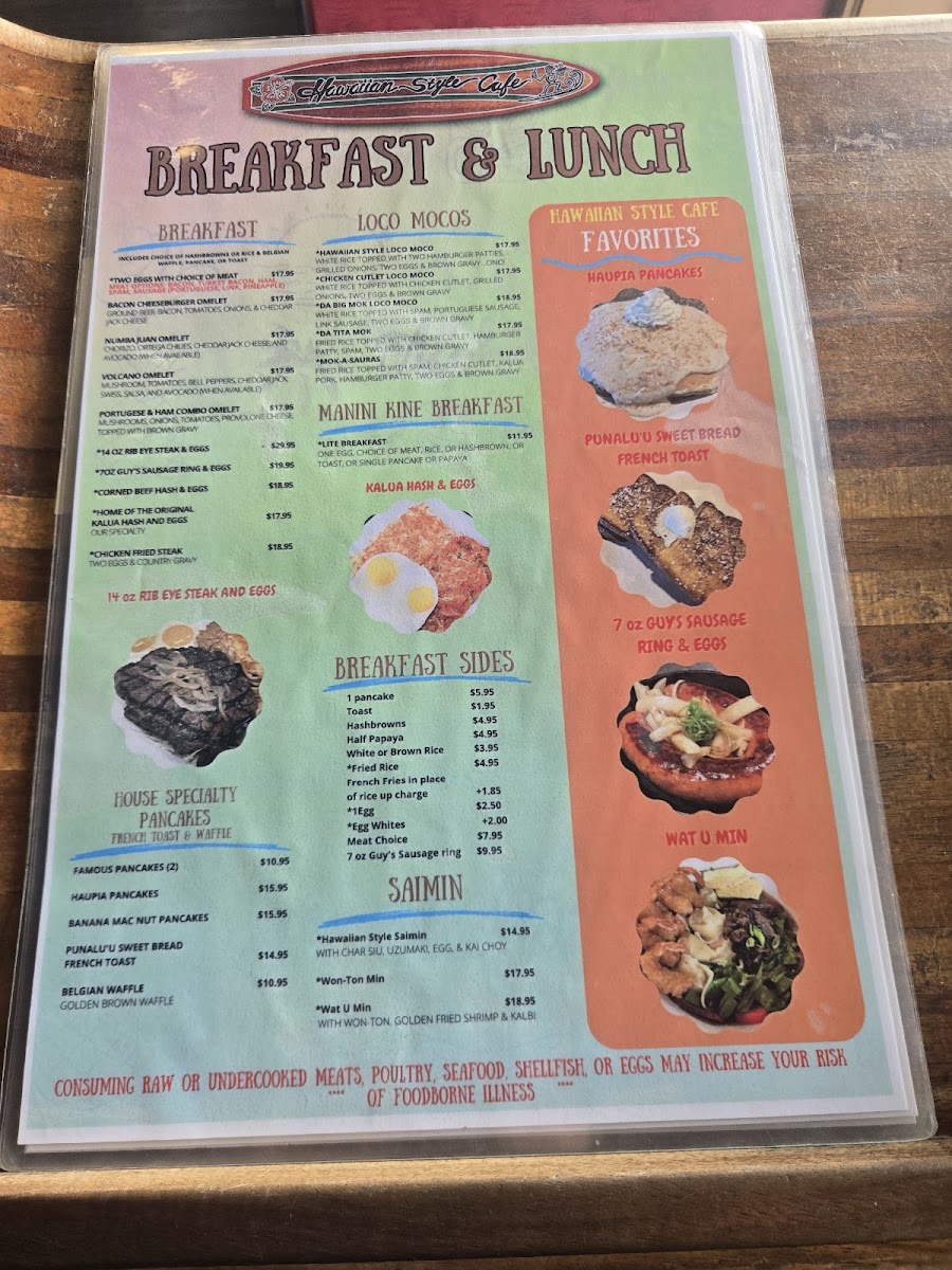 Fried rice topped with SPAM, chicken cutlet, kalua pork, hamburger patty, two eggs and brown gravy