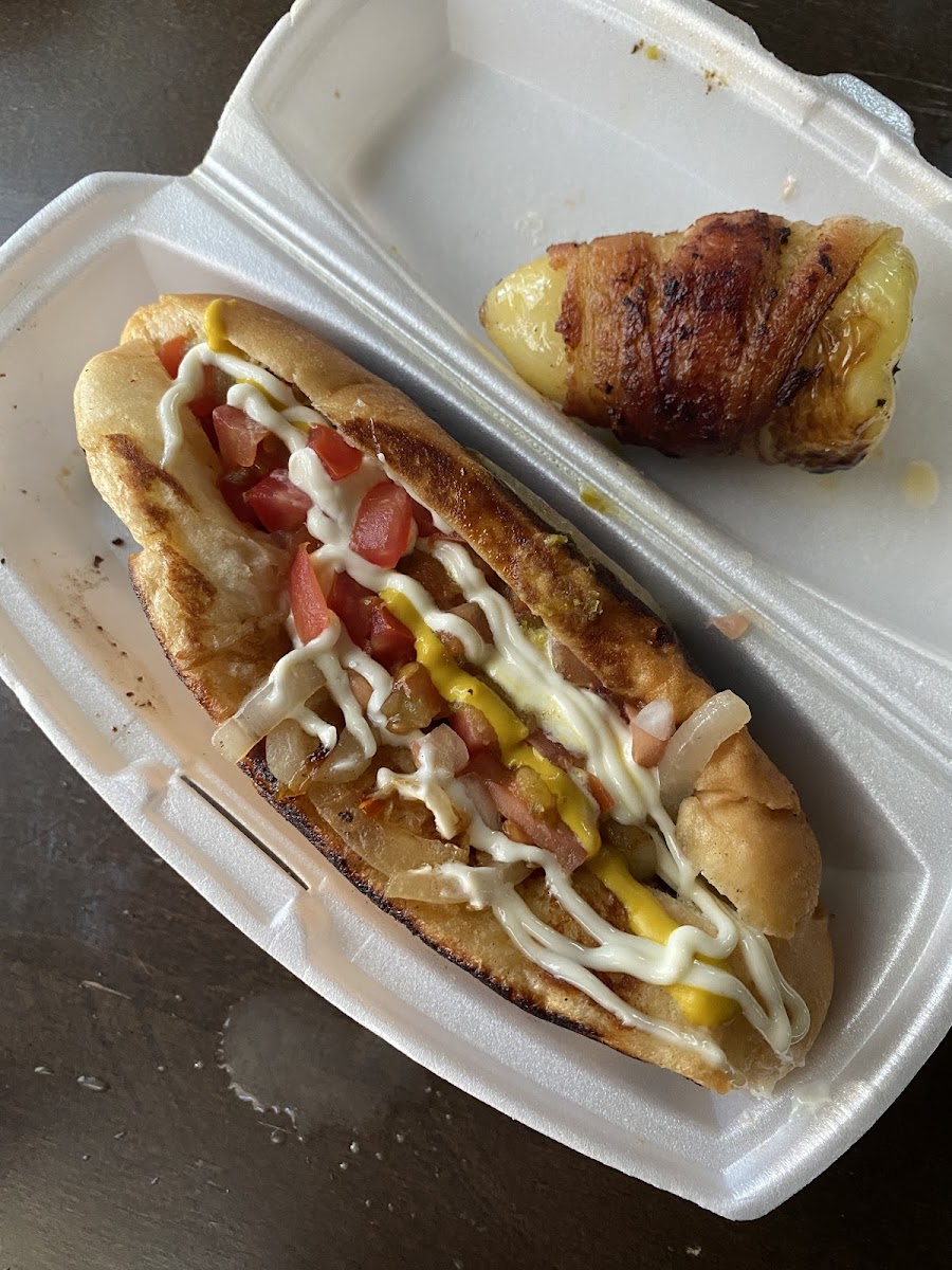 Hi, just wanted to give this place a 5 star rating. The hotdogs are so good. I love that they don't overflow the hot dog to the point where you can't bite into the hotdogs and make a huge mess. They load it perfect to pick up bite into the hotdog and able to taste each ingredient on the hotdog. The price is so reasonable. $4.00 dollars gets you the hotdog with all the fixings, the cheese stuffed with cheese and wrapped in bacon, and a side of fries. You can't beat the price. I didn't know it came with a side of fries.