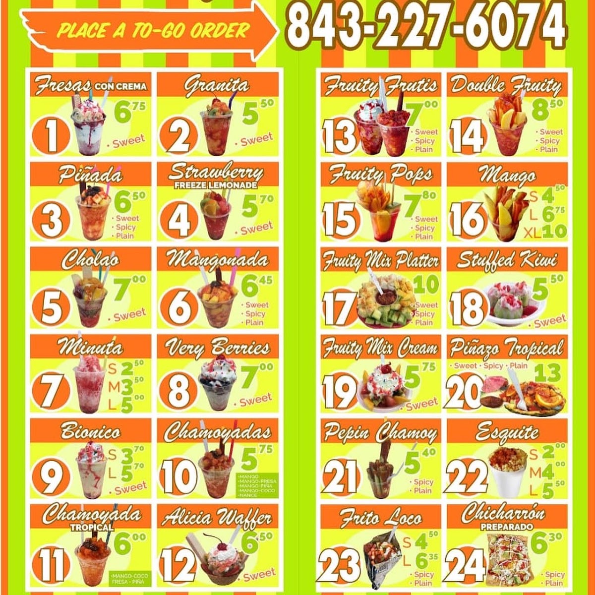 Half blue spirulina sorbet and half coconut base, granola, mango, strawberry, kiwi, coconut flakes, chia seeds, Nutella drizzle, honey.