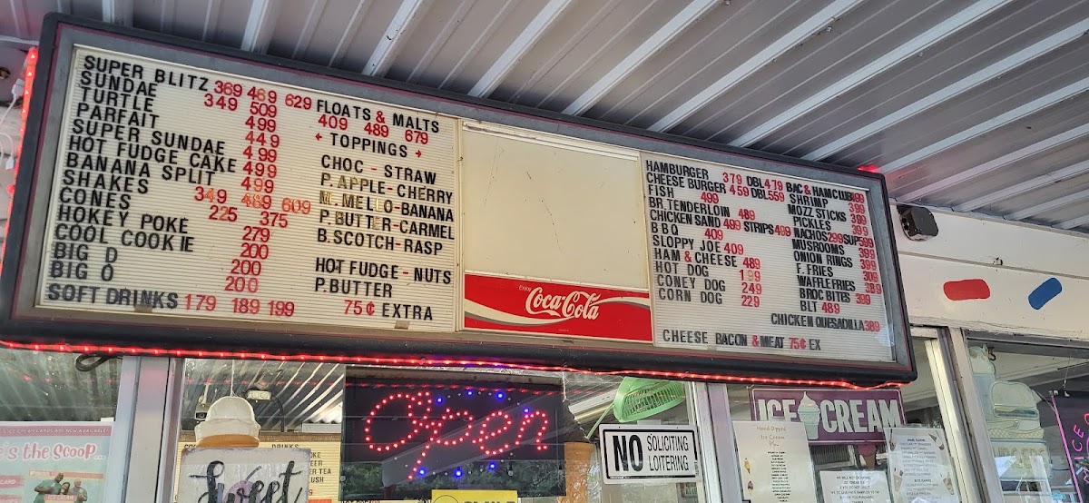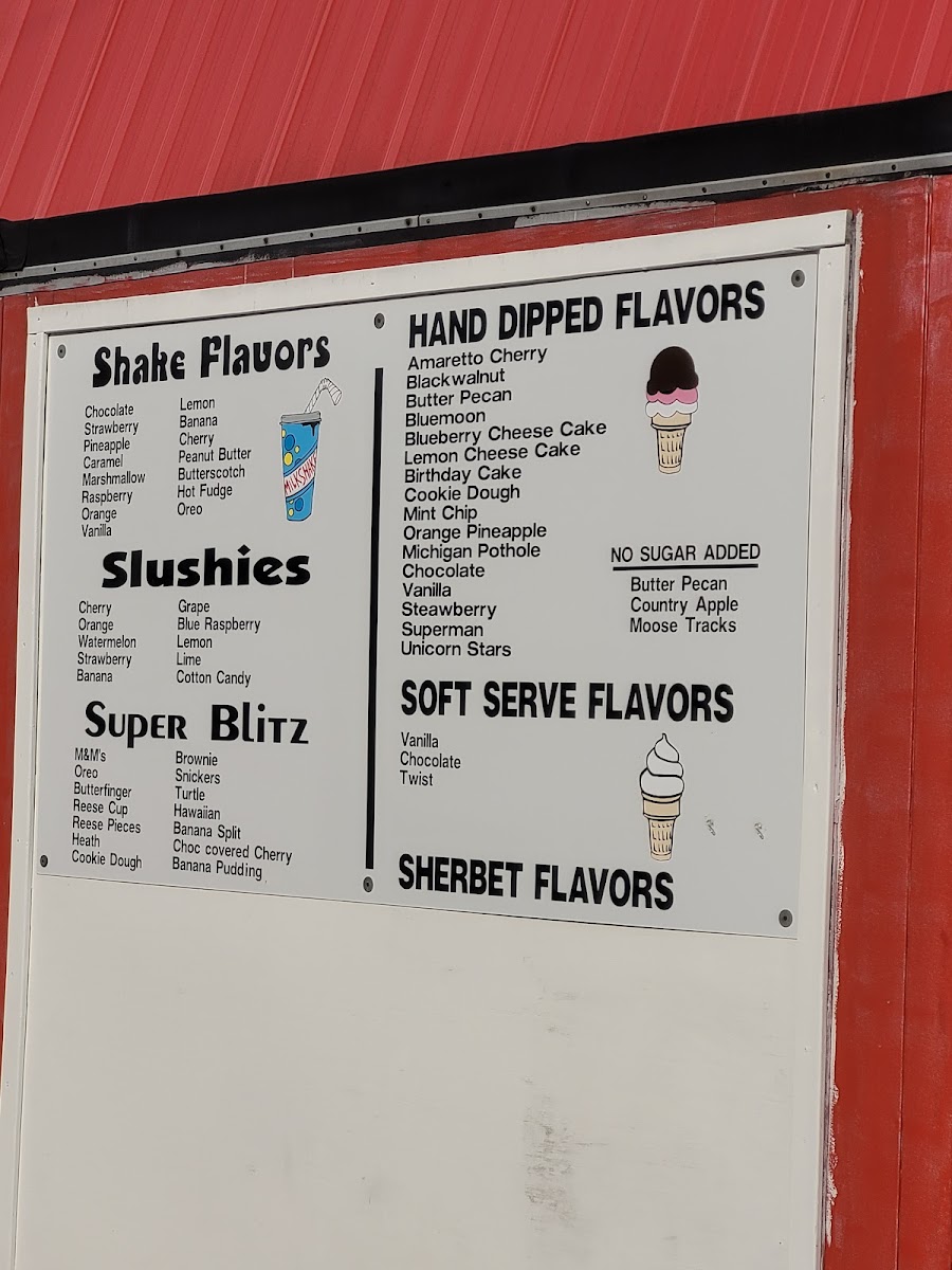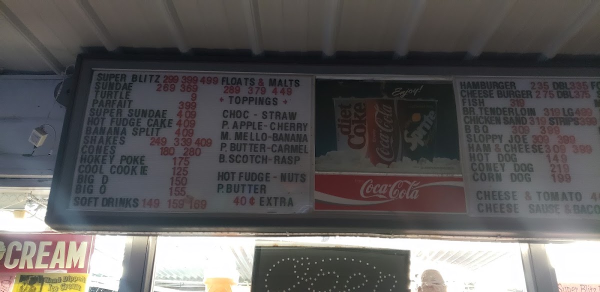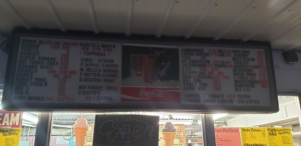 HOT FUDGE, PEANUT BUTTER, BANANA, CANDIES, NUTS, EXTRA THICK SHAKE, BACON, CHEESE, SOUR CREAM. FOR EXTRA TACO OR CONEY.