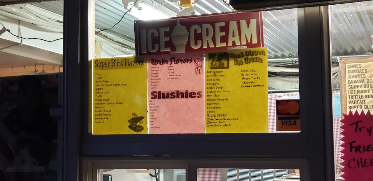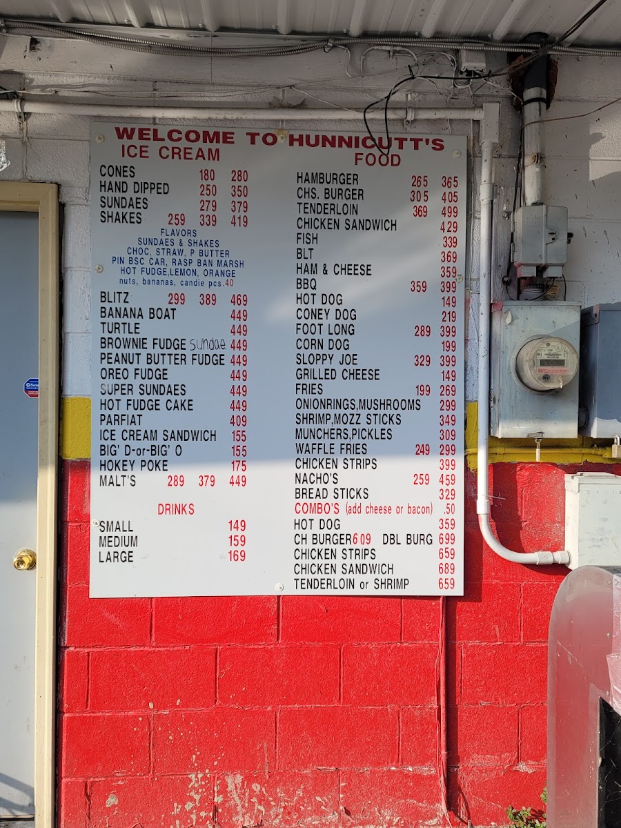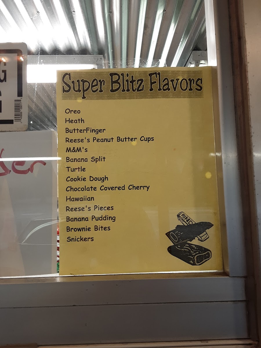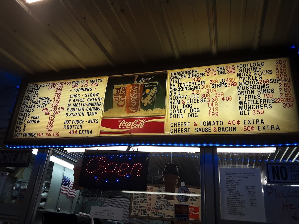 HOT FUDGE, PEANUT BUTTER, BANANA, CANDIES, NUTS, EXTRA THICK SHAKE, BACON, CHEESE, SOUR CREAM. FOR EXTRA TACO OR CONEY.