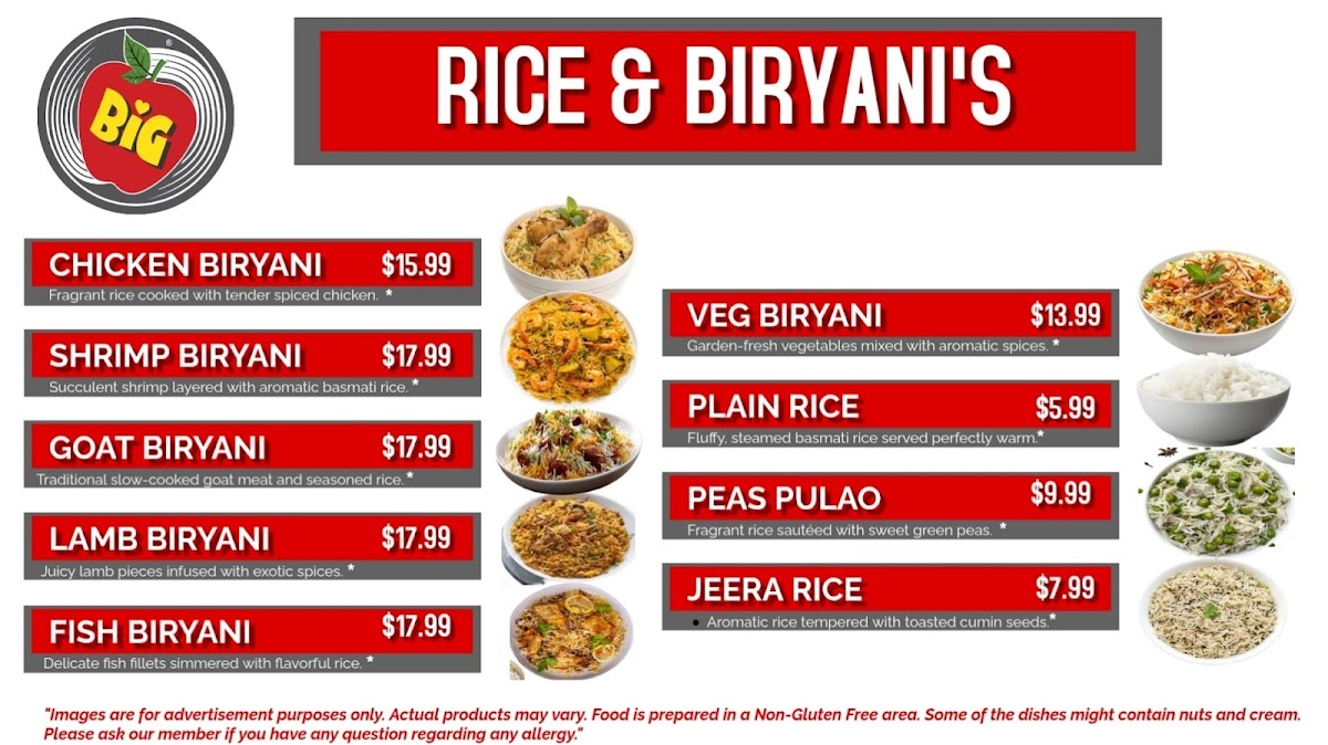 Basmati rice cooked with chicken, onions, garlic, ginger, cashew nuts, raisins, and spices served with raita.