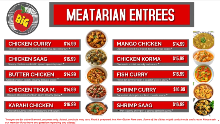 Traditional dish cooked with boneless chicken, onions, garlic, ginger, tomatoes, curry spices, and mixed in mango sweet sauce.