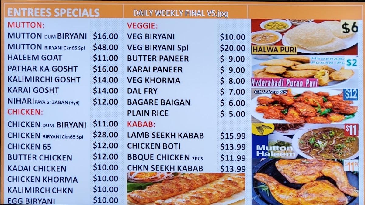 A special treat from the Hyderabad long grain basmati rice dum with spiced chicken to perfection and topped with crispy fried onion. Served with raita and mirchi salan. Special yogurt sauce. Regular - 1 person Family pack - 2 person