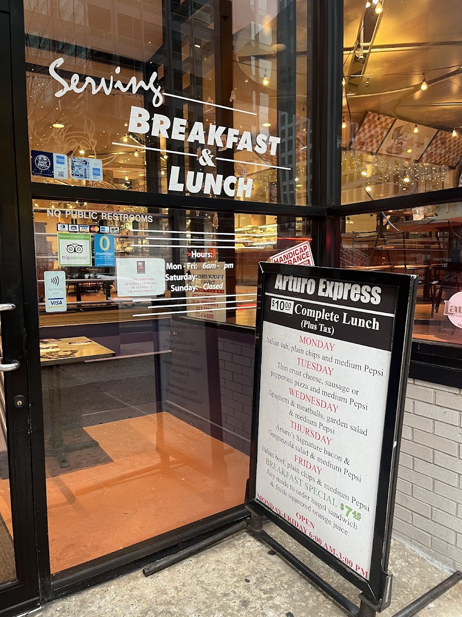 Arturo Express Restaurant And Catering is an Italian restaurant situated at 130 S Canal St, Chicago, IL 60606, United States. It has garnered 307 user reviews. The busiest times to visit involve waits up to 45 minutes on Monday afternoons; shorter peak waits of about 15 minutes occur during weekday and weekend evenings, while Tuesdays are generally wait-free. The menu highlights Italian classics including Lasagna, Genoa Italian Sub, Tuscany Italian Beef, and specialty items such as the Soup & 12 Deli Sandwich and the Snickerdoodle Breakfast Sandwich, offering a variety of authentic Italian flavors in a convenient downtown location.