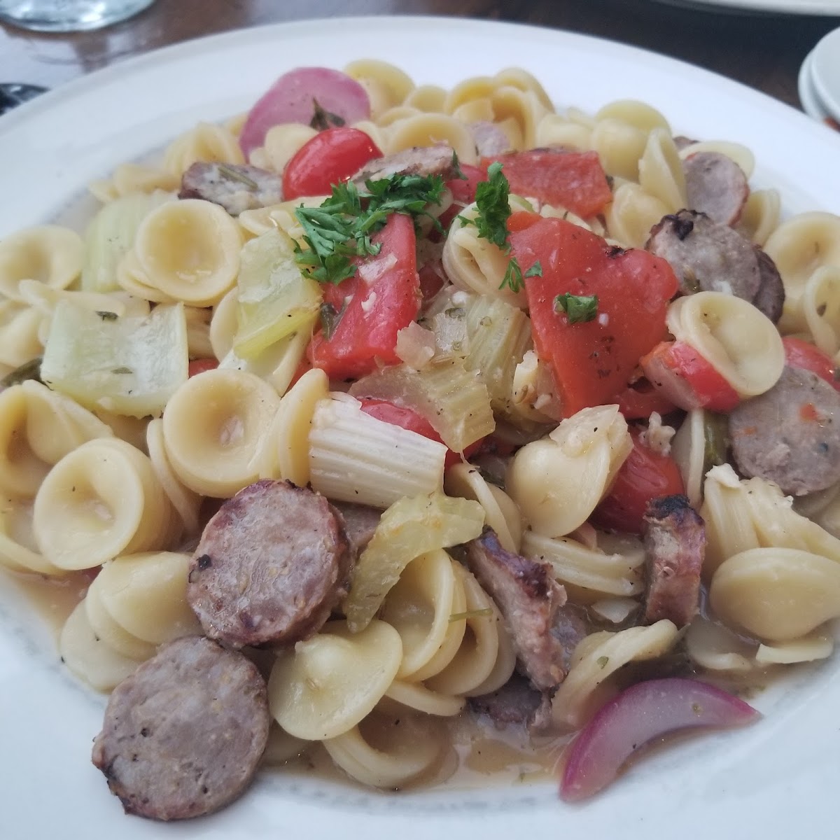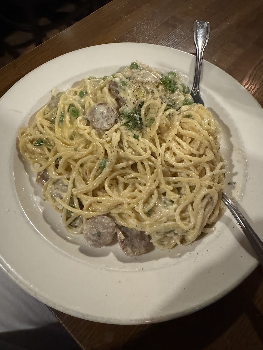 I Came across this place while driving through this cute town. As soon as I’m entered, I was greeted by three different women. One was a customer at the bar. One came with children as well, and they came to greet me. Then, a third, approached me, and welcomed me. To me, that set the stage for such a friendly and inviting restaurant. It seems to have regular customers, and everybody knows each other and greet each other with news of their own families. The waitress was prompt to sit me in a comfortable table and asked me if I would like something to drink. I asked her questions about how the food is cooked and she was very candid with me. I really appreciate that. I ordered the pasta fagioli. It was very tasty and the fresh celery elevated it for me. The small shells were a little overcooked, and that was the only flaw of my meal. I ordered the spaghetti carbonara with sausage, and that is what’s pictured below. The sauce was delicious. The macaroni was done to perfection. Al dente. The small coins of sausage were sliced for easy eating. If I am up this way again, I would definitely stop here for some very good unassuming Italian food.