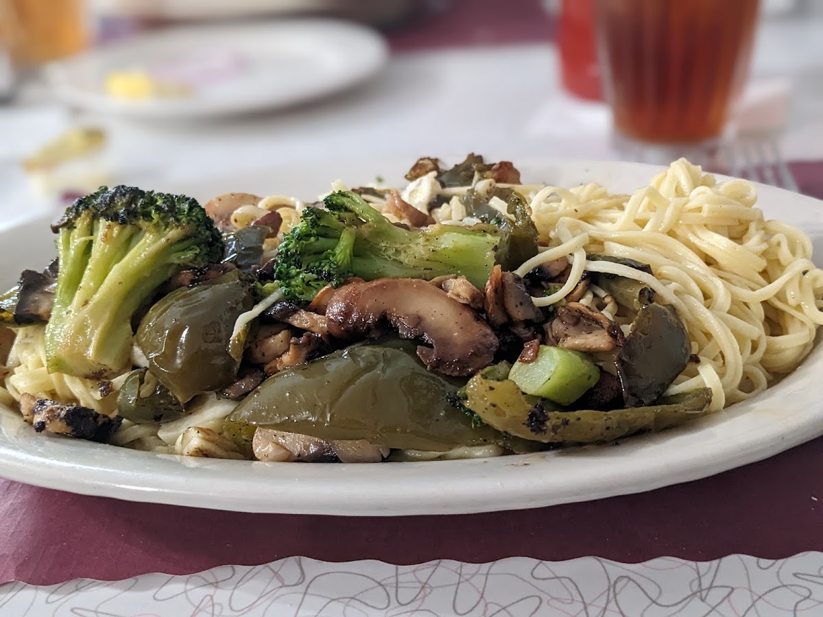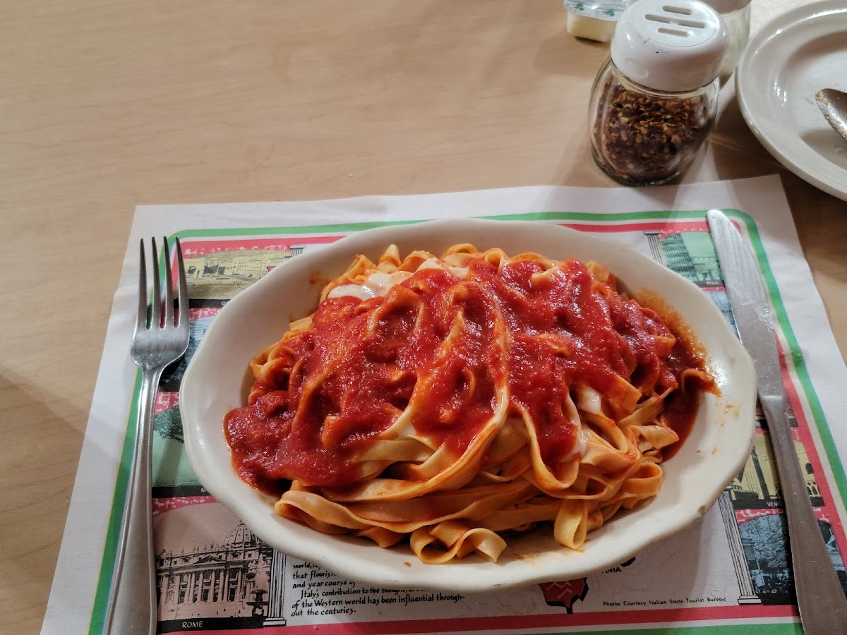 The food is delicious! Homemade pasta, very fresh ingredients. Vegetarian options, and they can customize pasta dishes for vegetarians. My custom dish was a homemade noodle with sauteed broccoli and mushrooms in a garlic and oil sauce. It was excellent. Vegetarians please note that there is no marinara sauce: the red sauce is cooked with meatballs. Vegans - not a good choice for you. The pasta is made with egg. Super friendly service. Comfortable, small town atmosphere where everybody knows everybody. We felt welcome even though we were just passing through.
