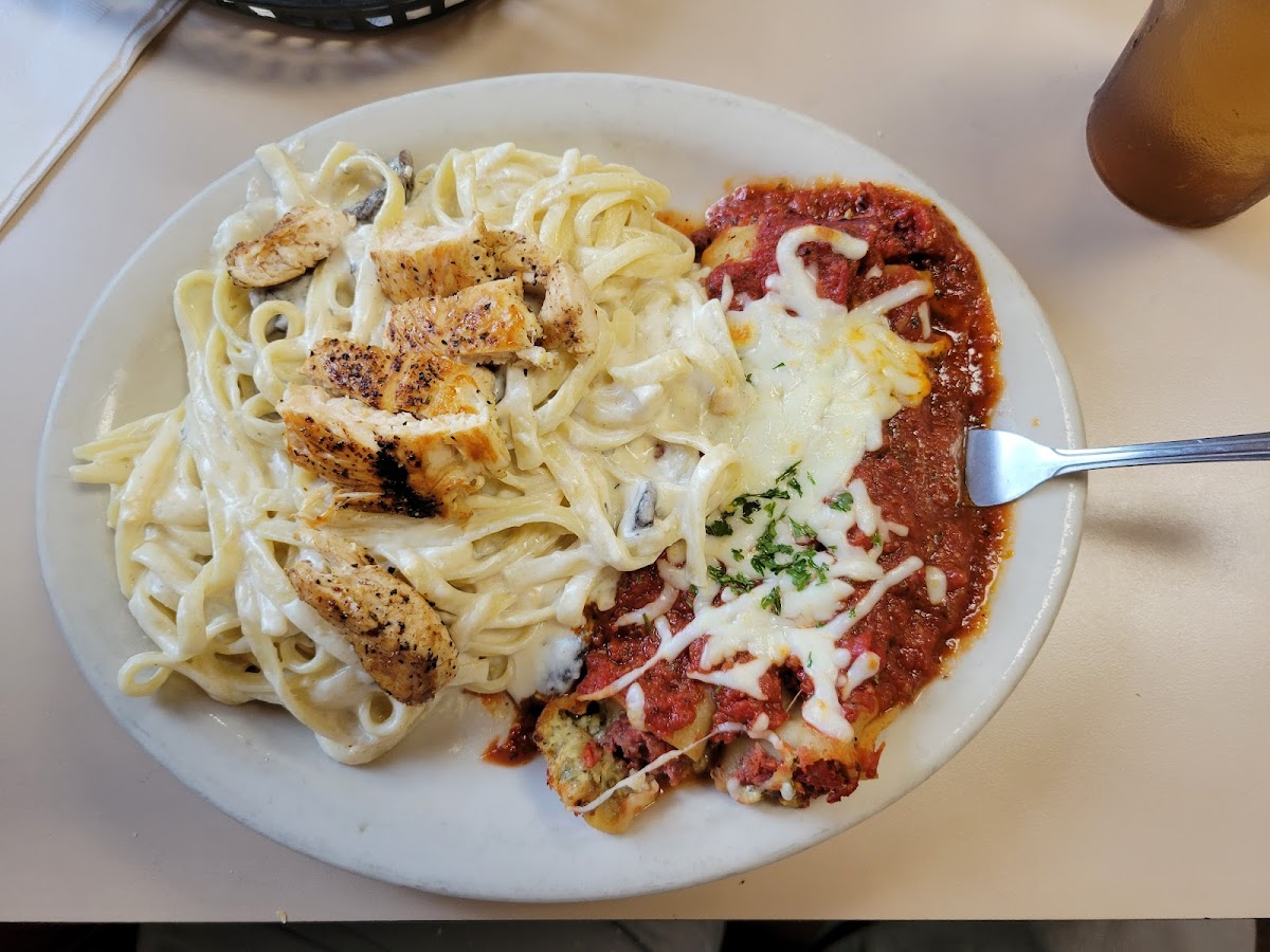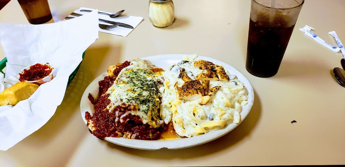 Amazing seafood alfredo, shrimp, halibut, and scallops cooked perfectly, turkey noodle soup so good , mmmmm, mmm AND RUSSIAN CHOCOLATE CAKE ! Wow ! All to go for lunch, quick and tasty
