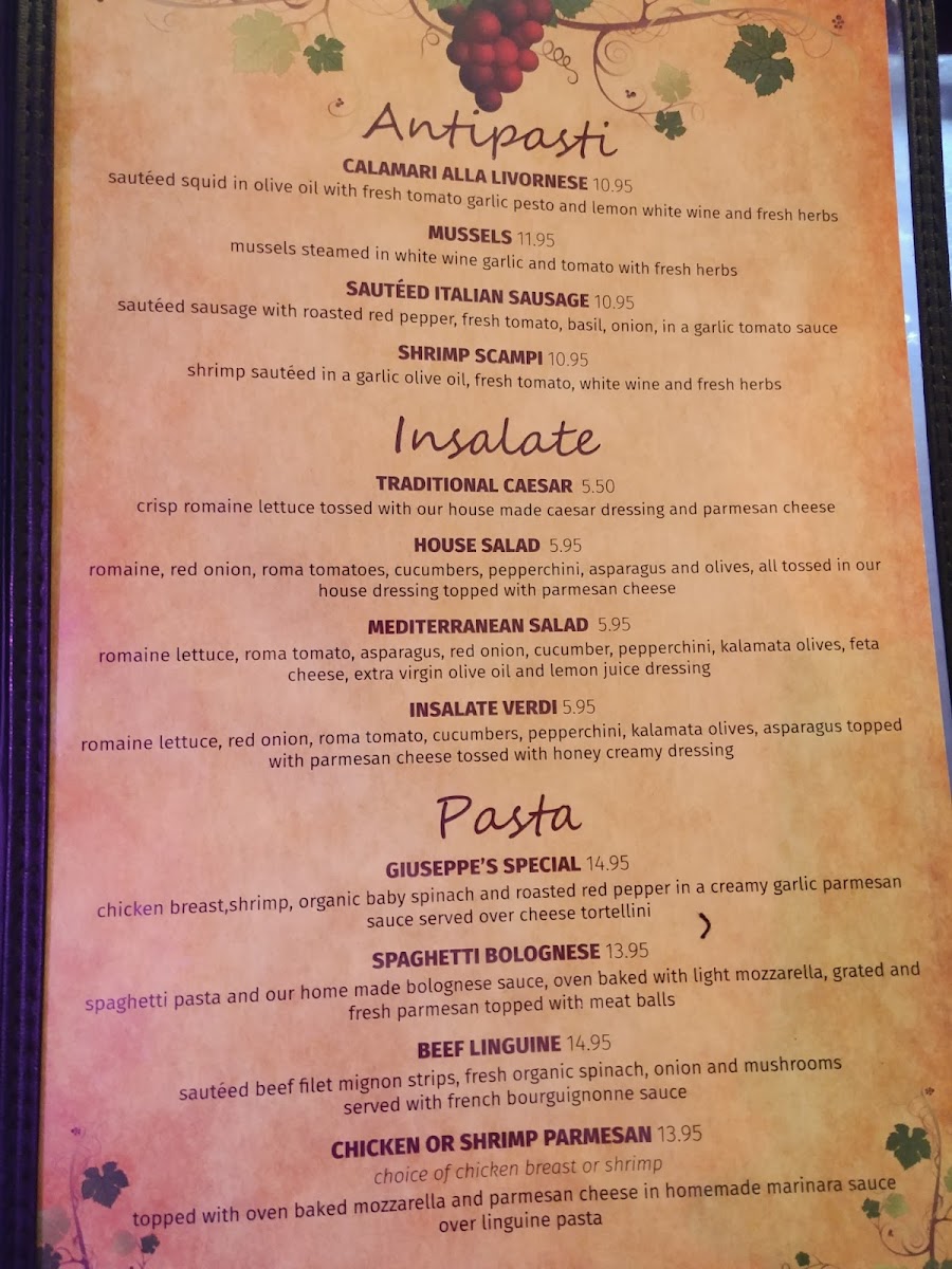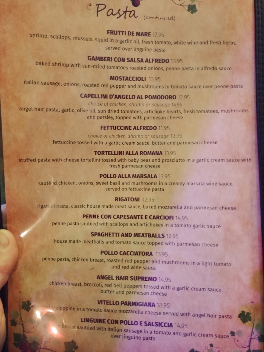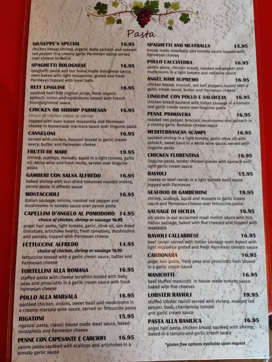 Shrimp, scallops, mussels, squid in a garlic oil, fresh tomato, white wine and fresh herbs, served over linguine pasta