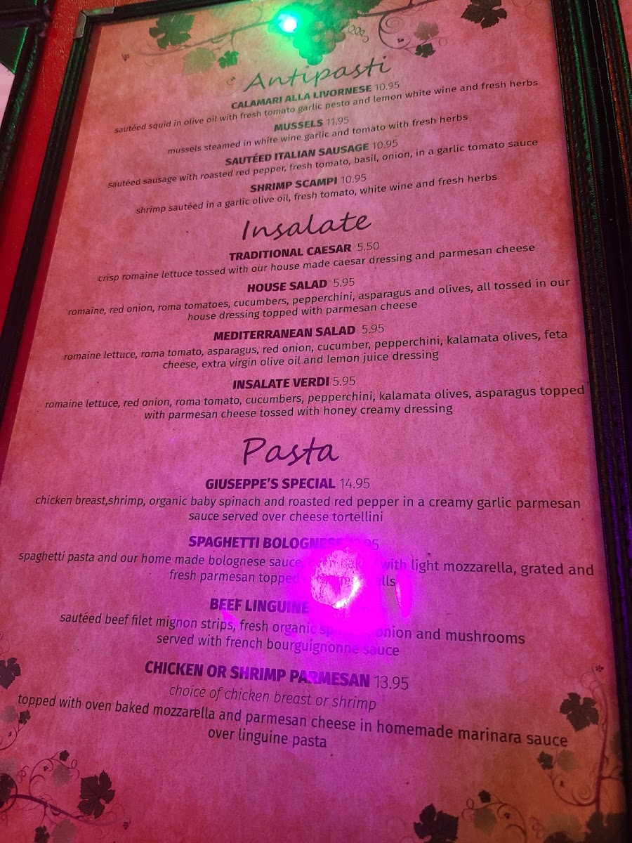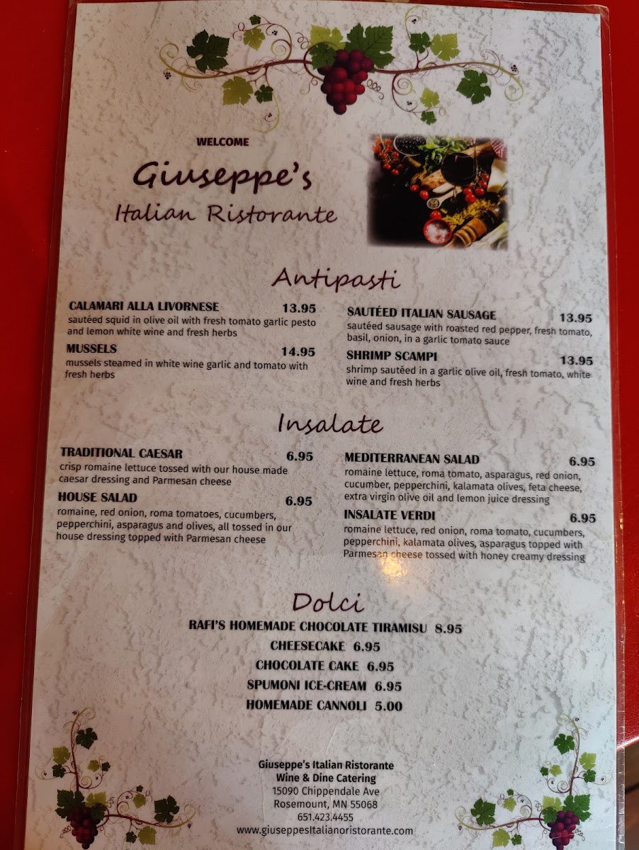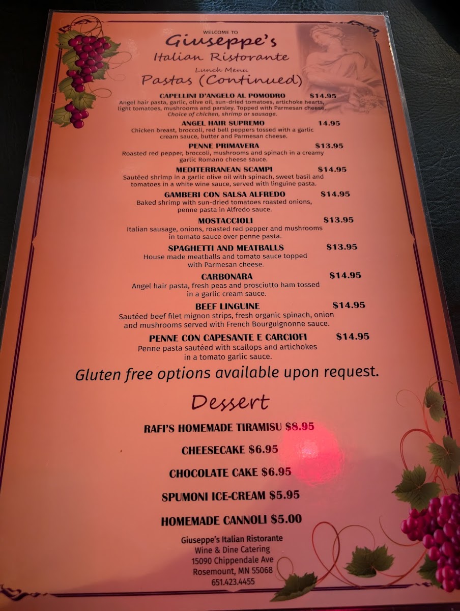 Shrimp, scallops, mussels, squid in a garlic oil, fresh tomato, white wine and fresh herbs, served over linguine pasta