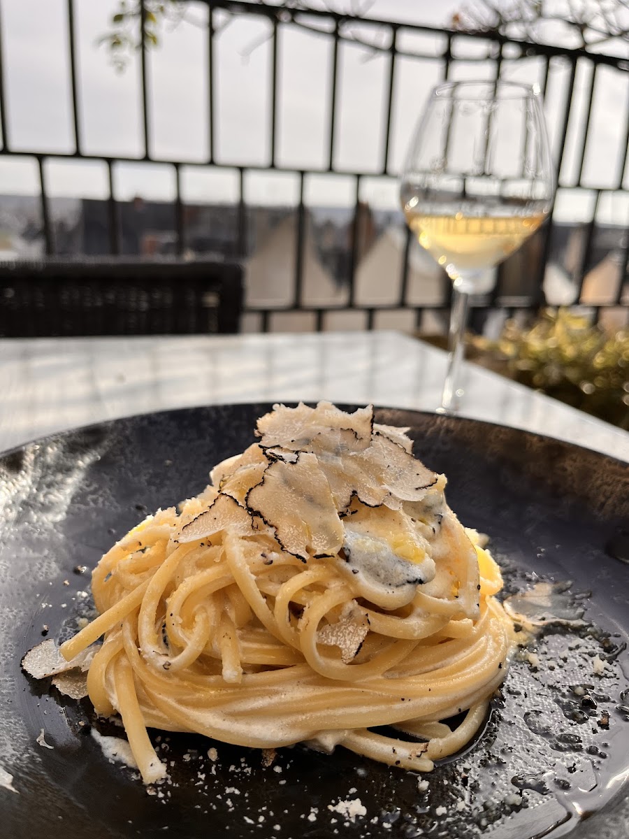 A little hard to find when relying on a car--Google Maps didn't understand that it was on a different level in the city. We ended up figuring it out by parking down in the square below and walking up the stairs. The stairs are plentiful and steep but there's a railing and a bench halfway up. (Our parents needed this help.) But then we got to this charming little restaurant and got to sit on their beautiful terrace that overlooked the city and river below. The food was worth the treasure hunt! Although we've been loving the French fare, we were ready for a little something different and this delectable Italian cuisine fit the bill.