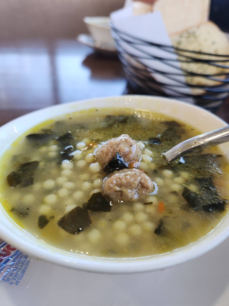 Best wedding soup, the food portion are incredible. Order the hamburger it will feed two people The desserts are to die forstaff are amazing. Love this place.