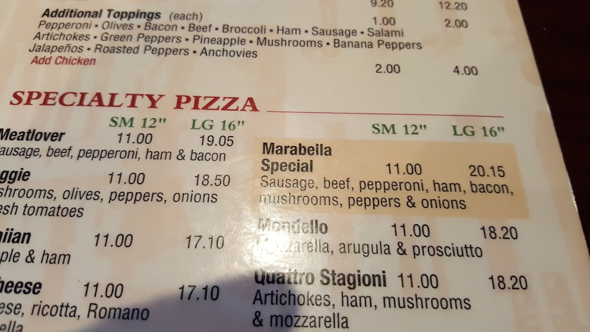 Pepperoni, sausage, beef, ham, bacon, mushrooms, green peppers, onions, mozzarella & tomato sauce
