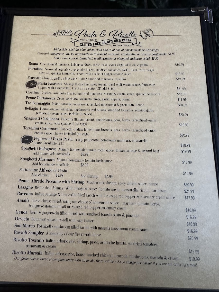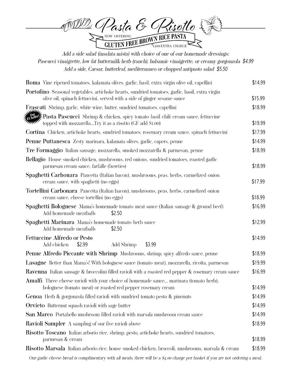 Served with a side of spaghetti bolognese (tomato-meat sauce). spaghetti marinara (tomato-herb sauce), or fettuccine alfredo (parmesan cream sauce)