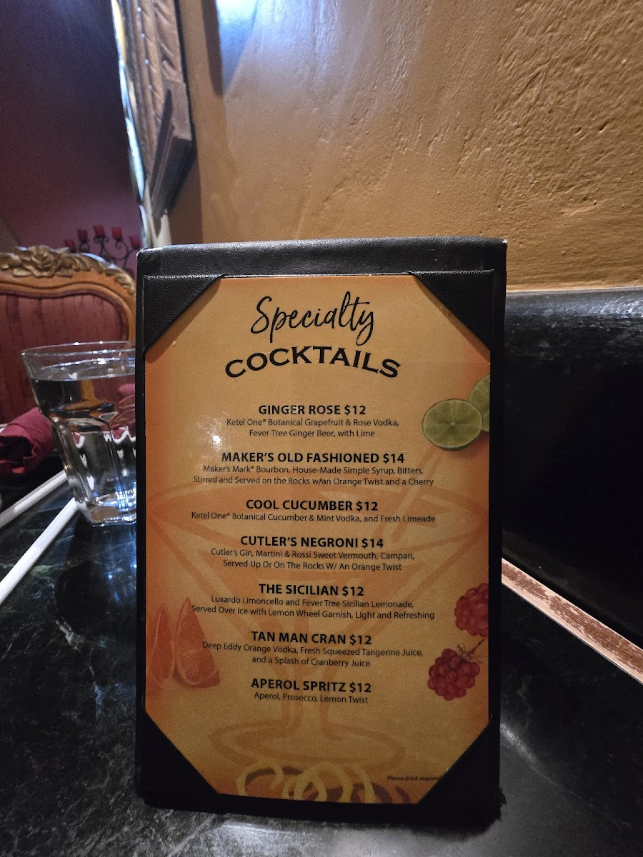 Cutler's gin, carpe antica, sweet vermouth, campari. Served up or on the rocks w/ an orange twist