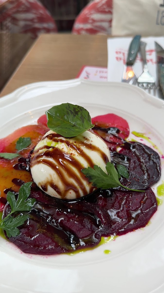 After 15 miles of walking around Paris we decided to stop by here for dinner. I must say I very much enjoyed everything about Piccola Mia. We had the Charcuterie’s and Fromage which realistically could be a meal itself but, we didn’t stop there! Throw in a delicious homemade peach tea,(I couldn’t even snap a shot before it was mostly gone!) a Burrata and Beetroot salad as well as a pepperoni and mushroom pizza and we could have not asked for anything more.