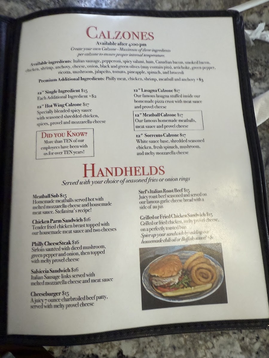 Create your own Calzone. Maximum of three ingredients per calzone to ensure proper internal temperature. Each additional ingredient – $1.99.