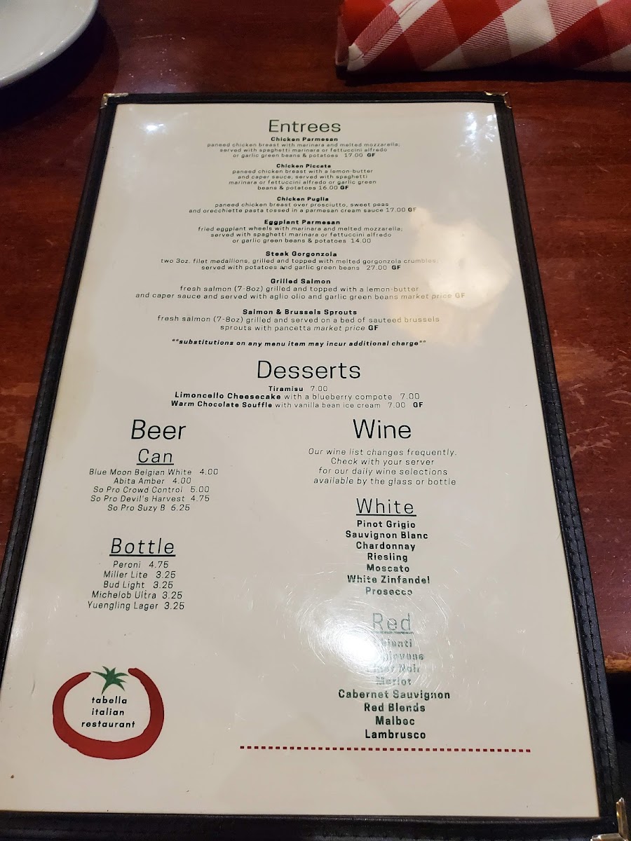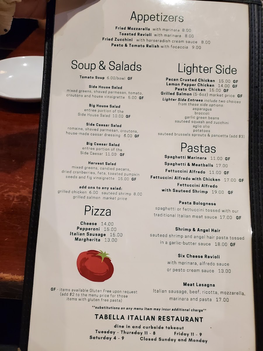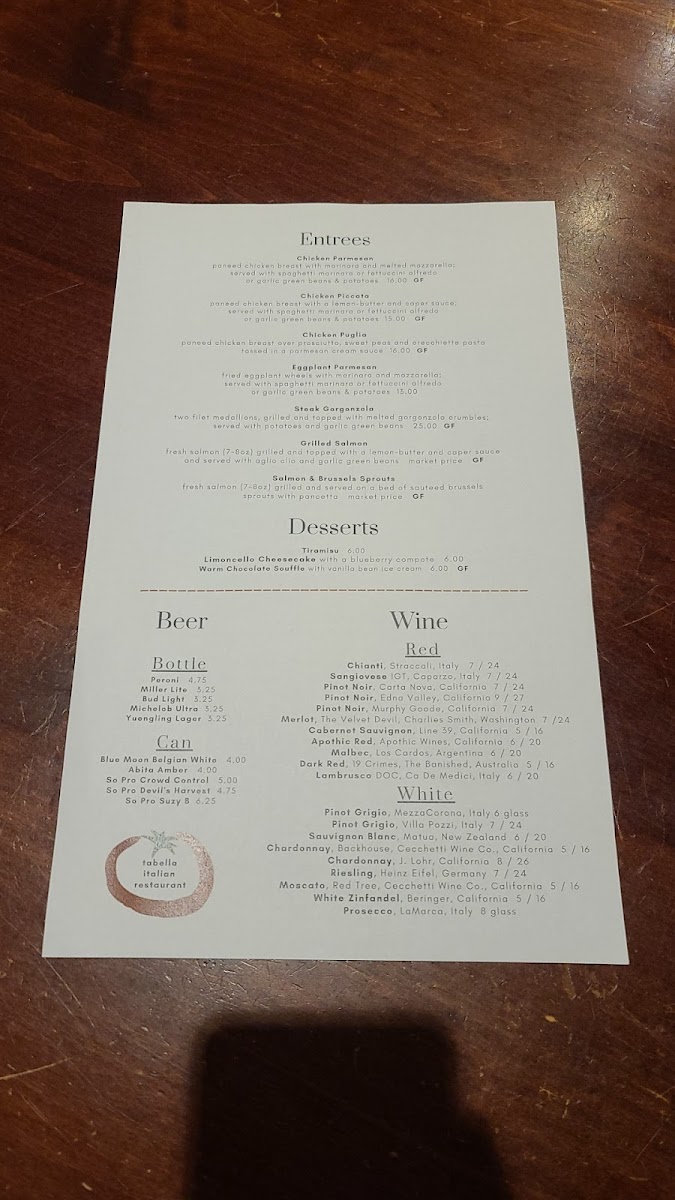 Paneed chicken breast with a lemon-butter and caper sauce; served with spaghetti marinara, fettuccine alfredo, or garlic green beans & potatoes.