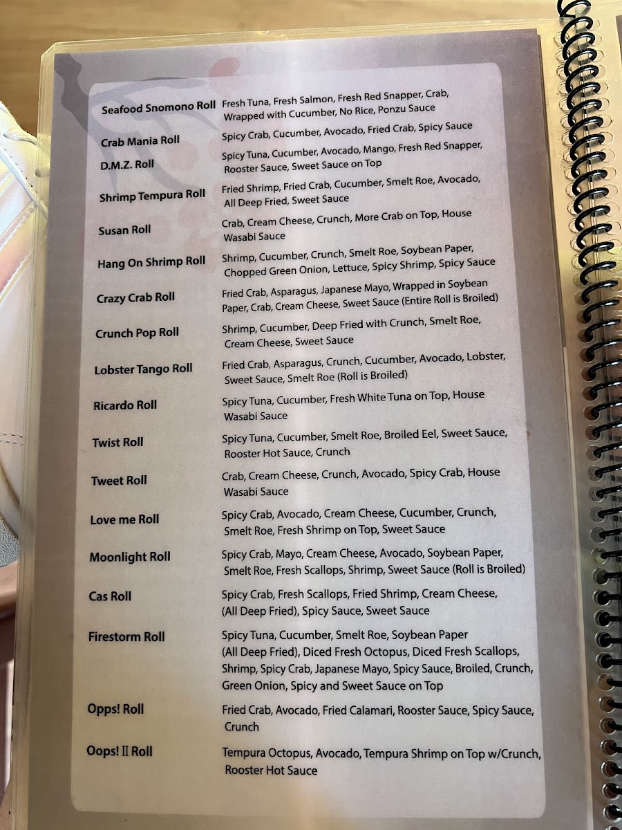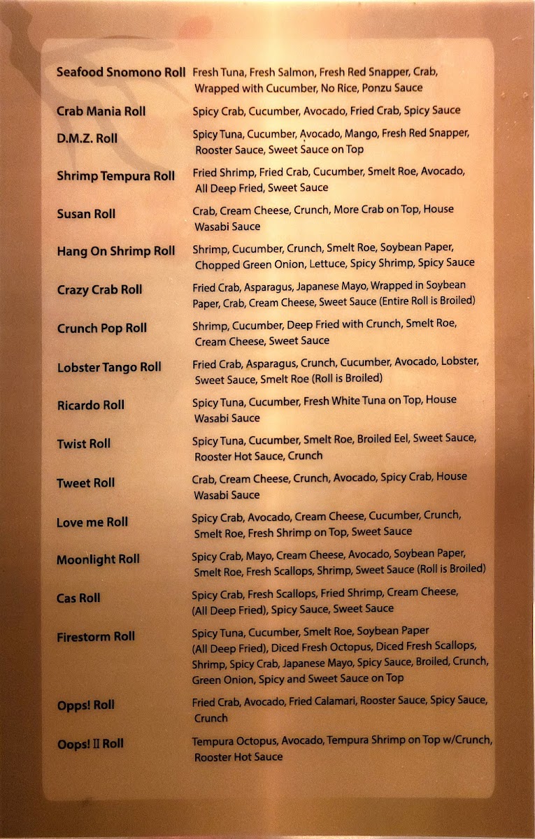 Spicy Tuna, Cucumber, Smelt Roe, Soybean Paper, (All Deep Fried), Diced Fresh Octopus, Diced Fresh Scallops, Shrimp, Spicy Crab, Japanese Mayo, Spicy Sauce, Broiled, Crunch, Green Onion, Spicy and Sweet Sauce on Top