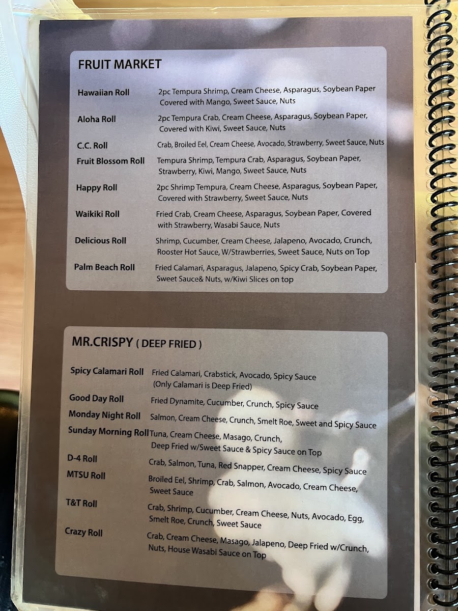 ( tuna, cream cheese, smeltroe) Deep fried, crunch, sweet and spicy sauce.