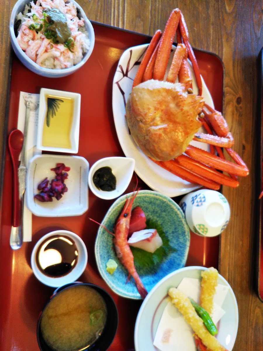3回目の利用です 今回はこちらでの昼食だとは気が付かずにお伺いしました(バスツアー) 今までは2階で海鮮丼等を頂いていましたが、初めて蟹の会食を頂きました 量的には充分過ぎるぐらいで高齢者には多すぎるくらいだと思います かすみ蟹がこちらではズワイガニより美味しいとの説明をいただきました ひとり一ぴきの蟹、焼きガニ、蟹鍋、蟹のお造り、ご飯に最後に卵でおじや、小さなケーキにオレンジ1切れ、突き出しに柚子味の玉子焼き、海苔の佃煮、めかぶと豆類の和え物(小さくて少しづつ) 満腹で満足でした