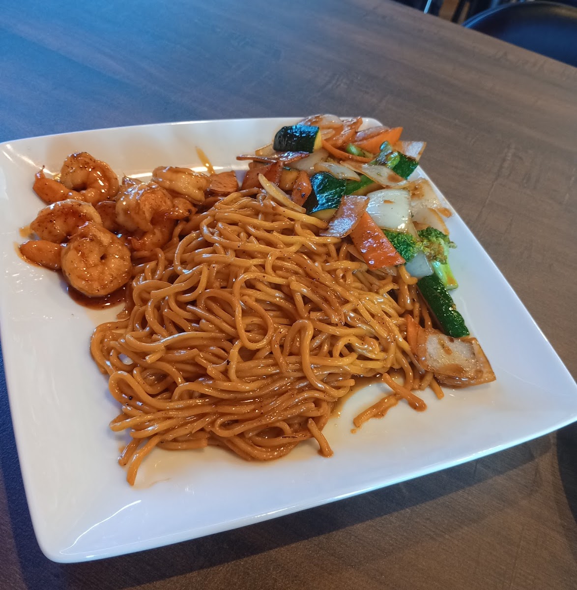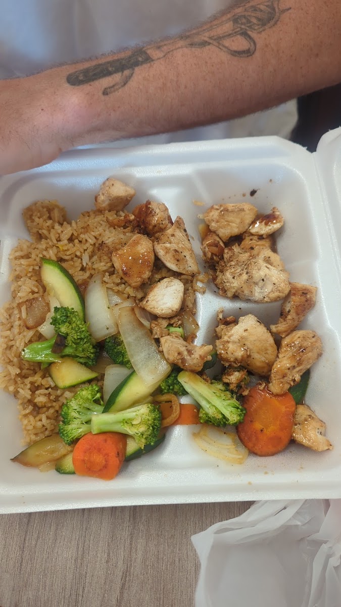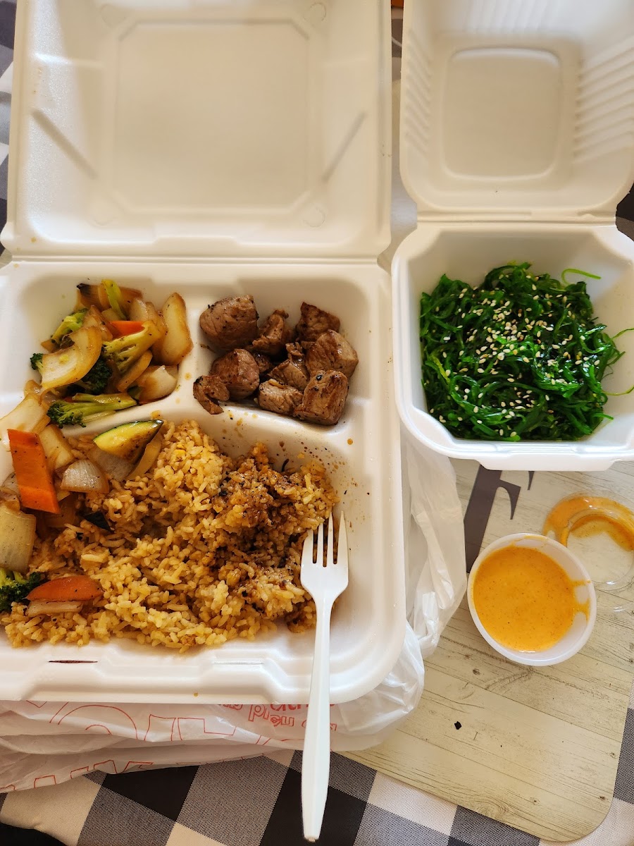 The food tastes good, different than some described. It's flavorful and cooked very well. The veggies are yummy and have a flavorful hibachi flavor with the soft crunch you'd expect from a perfectly grilled vegetable. The meat is tender, and delicious. The rice is moist and savory. The yum yum sauce is NOT watered down like another comment said, this I the perfect consistency and flavor for hibachi. The seaweed salad is yummy too. The only thing I really have to complain about is the amount of meat that comes with it is a bit sparse compared to other places I've been but over all the experience I've had is very positive. Pictured:( hibachi steak meal )fried rice, veggies, hibachi steak, yum2 sauce, and seaweed salad.