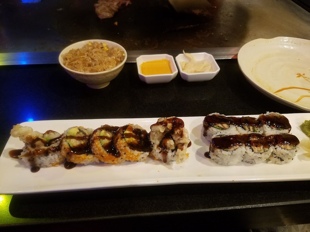 Delicious hibachi!! I got chicken and shrimp was and the meal comes with noodles rice and vegetables. Sushi is fresh and the rainbow roll was nice and big too. Our chef was very nice and put on a lovely show for us with a big smile. Bathrooms were not the best but maybe it was an off night.