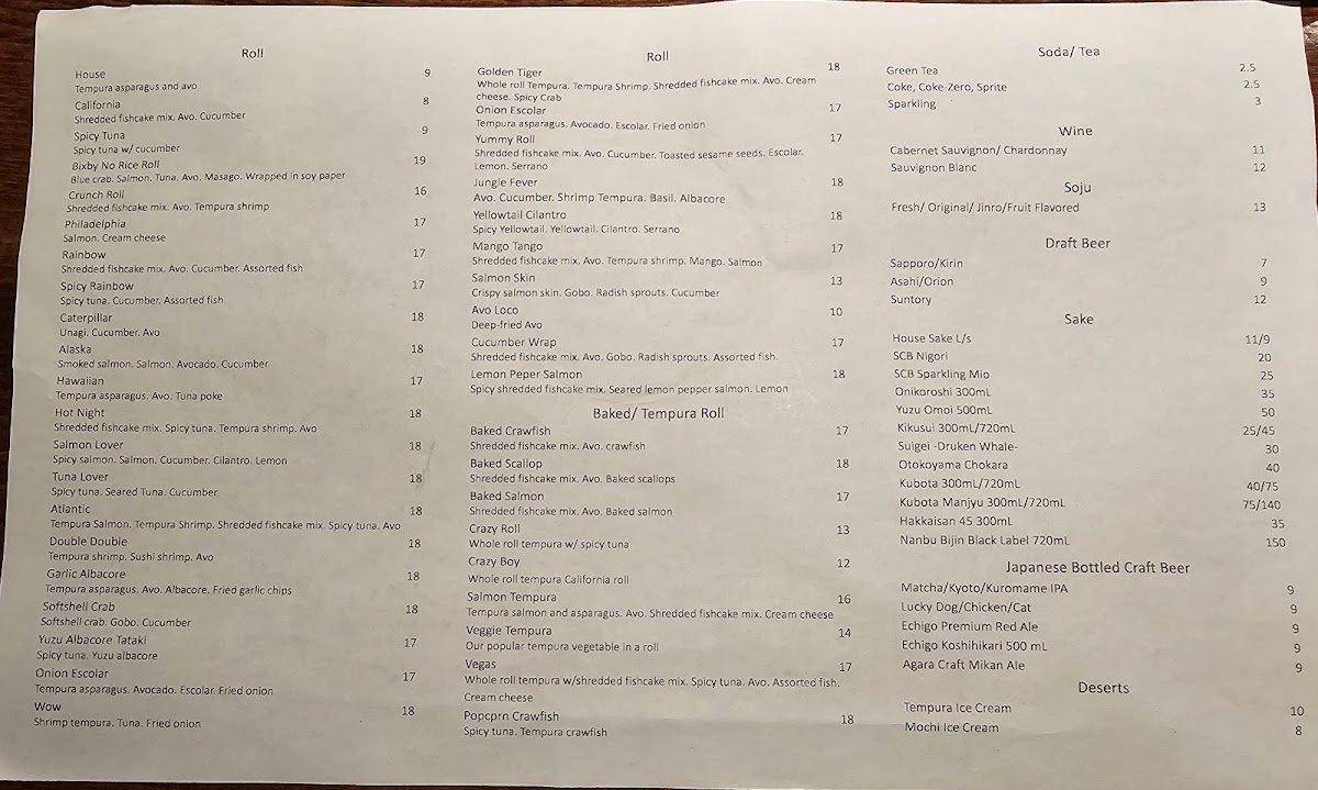 Whole roll tempura. Tempura shrimp. Shredded fishcake mix. Avo. Cream cheese. Spicy Crab