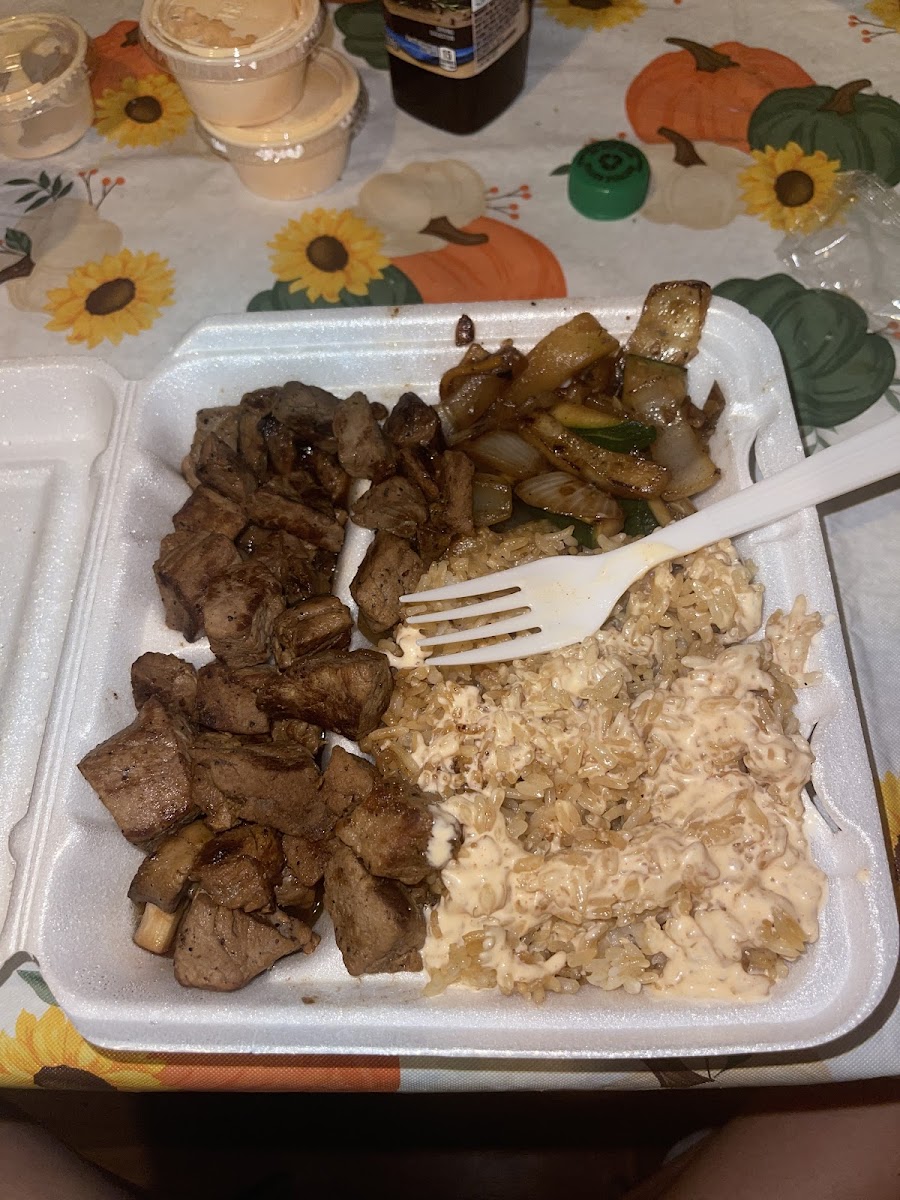 Their food is good, and the owner is friendly and even put in a pull-up railing for my mom to make it easier to get into the larger dining area. I personally like and recommend the hibachi salmon plate, steak bowl medium rare, broccoli and mushrooms bowl, their wings, the Philadelphia Roll, the Dragon Scale Roll, and the clear soup in particular, and my husband really likes the crispy chicken plate too. Sometimes their service is better than other times depending on who is waiting tables that day, but they have always been nice overall regardless. Their lunch prices are good also.