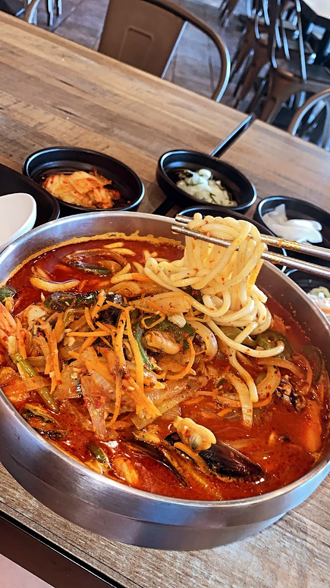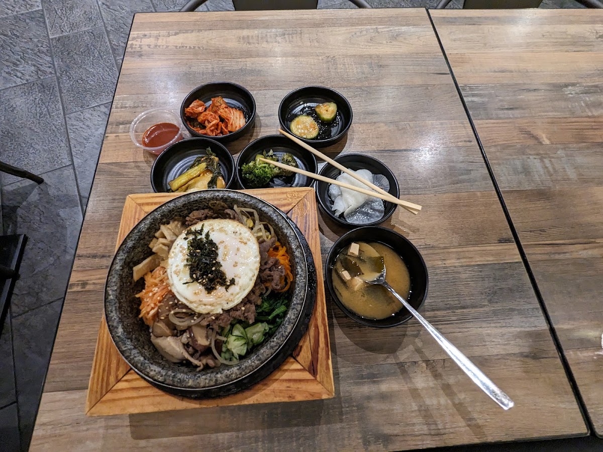 I was skeptical at first as it felt like it may be style over substance but we were very pleasantly surprised. Food was excellent and priced well and we’ve been to a lot of Korean joints over the years. Complementary bottled water, 5 dishes of banchan, miso soup and yogurt drinks after the after dinner. We both got bibimbap which were fully customizable, a first for us. No extra charge to get all the toppings (protein up charge aside e.g. double order, premiums like shrimp, etc.). Service was wonderful, property was clean as were the restrooms. Colorful paintings on the walls, not busy though we were there between lunch and dinner on a weekday. Plenty of free parking. Had imported Korean beer, a proper 500ml bottle of Terra, which I rarely see available out. Would visit again for sure.