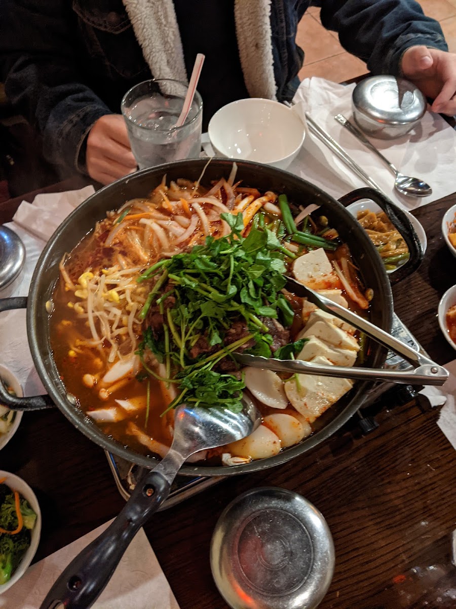 Excellent food! Not sure how safe it is to eat their crab meat though because my sister ordered a seafood hot pot and the crab meat was a dark gray. Other than that, everything else is delicious. I got the soondubu. Pretty good. Loved the emoji mushrooms inside, and the other vegetables were perfectly cooked as well.