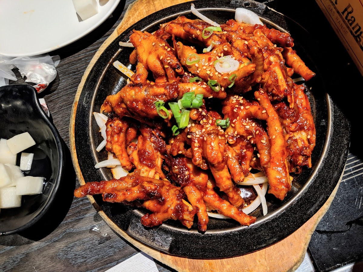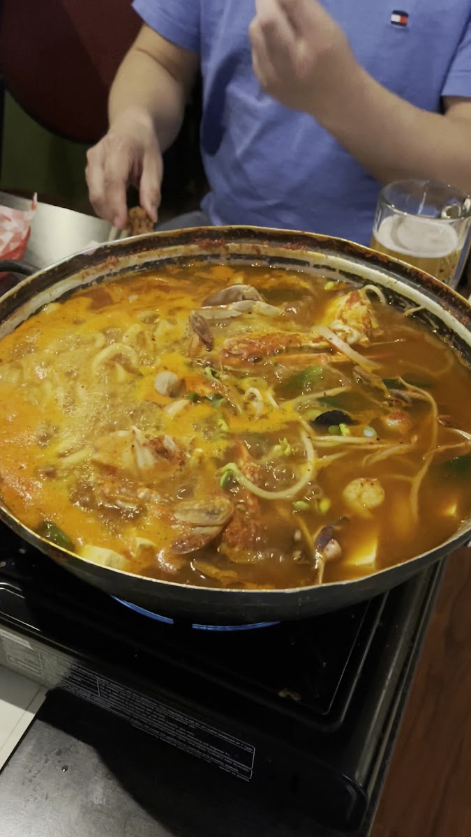 It was just us on a Monday night. I can't wait to come again on a busier night to get a better vibe. The pink Jinro soju frog was good company. Solid banchan: the chayote jalapeno pickle is a new must-have for me! We shared a scallion seafood pancake with tender calamari tentacles and padak fried chicken with piles of scallion flecked with sesame. Tasty food - terrible breath. You may want to avoid for a first date.