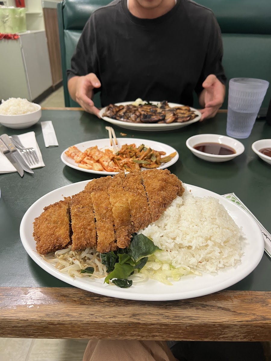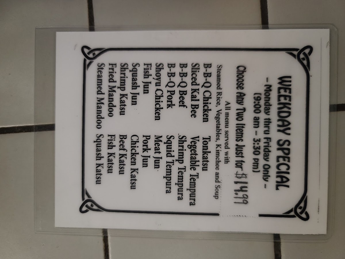 I ordered shoyu chicken & meat jun plate for $14.99 special and it came with 2 scoops of rice and more vegetatables on plate al also additional side dishes, which the server told me I could have a refill if I want to. When I got to try the food it tasted so good and also with the side dish. This is a very good price for a korean restaurant. The service was also great so it really made it a great visit.