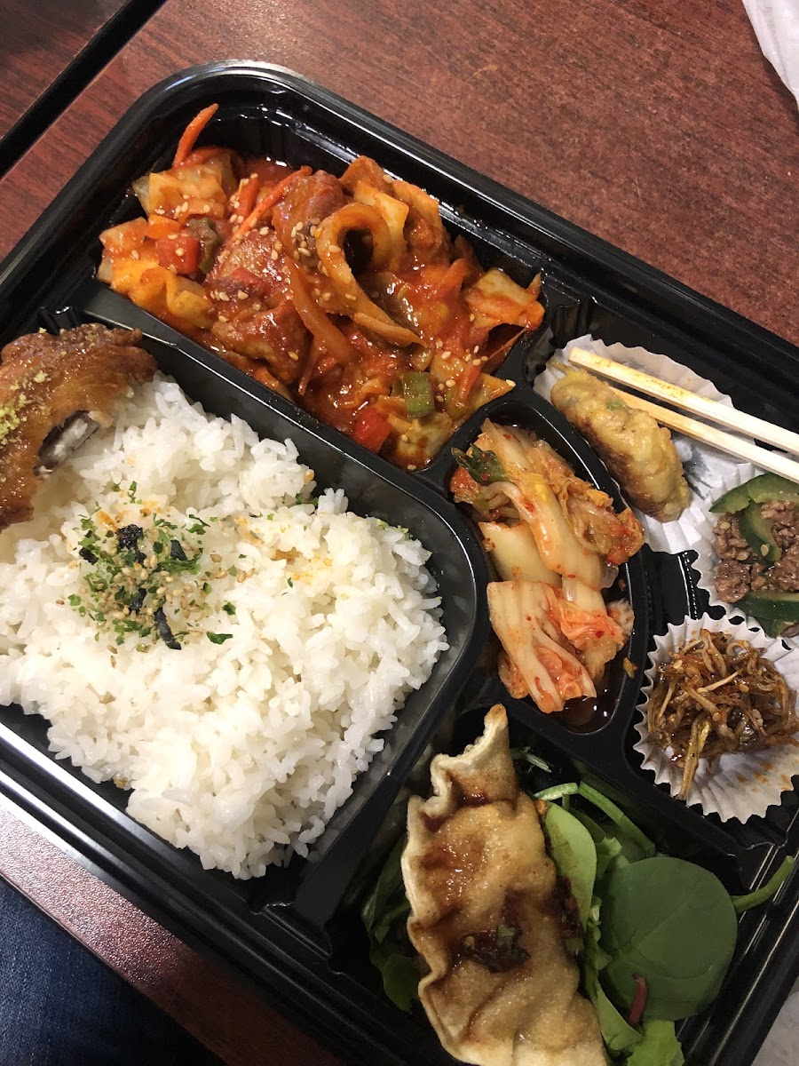 2024 update: This place is still amazing. They moved to a bigger location in the capitol mall. They have a different menu too. I got their summer chicken soup which was outstanding, ate everything. Their tuna mayo and beef gimbap are also delicious. I don’t think you can go wrong ordering anything here. The owners are the sweetest people and always check to make sure you enjoy the food and are taken care of. I really miss their chicken wings (some of the best in Iowa city IMO) but those may come back to the menu! I’m obsessed with this place now. I can’t remember how I found it but I’m glad I did. Their bento boxes are wonderful. I love that they always change the side dishes you get with it and so far all have been delicious. I’ve had spicy pork and Korean bbq beef so far, preferred the pork. The chicken wings are probably the best I’ve had in Coralville/NL/Iowa city..soooo good and cooked to perfection. I can’t wait to try the whole menu.