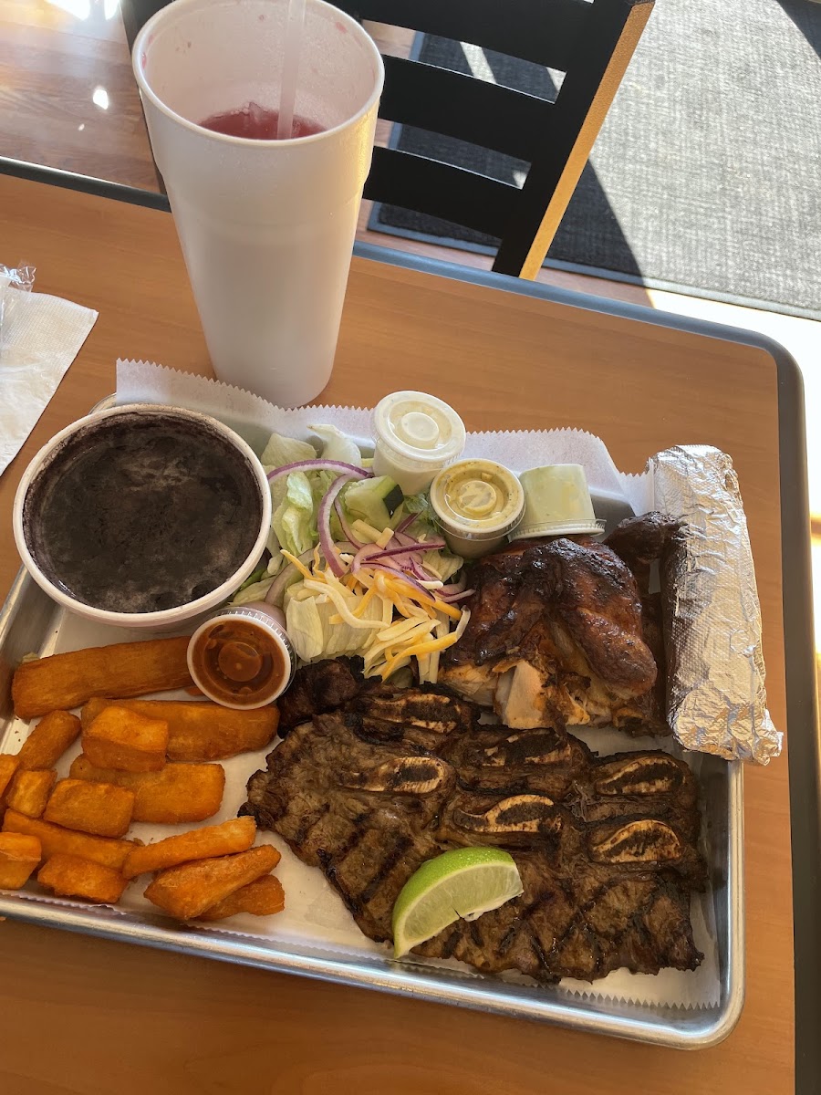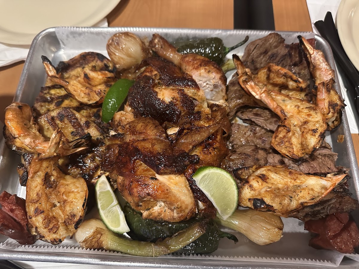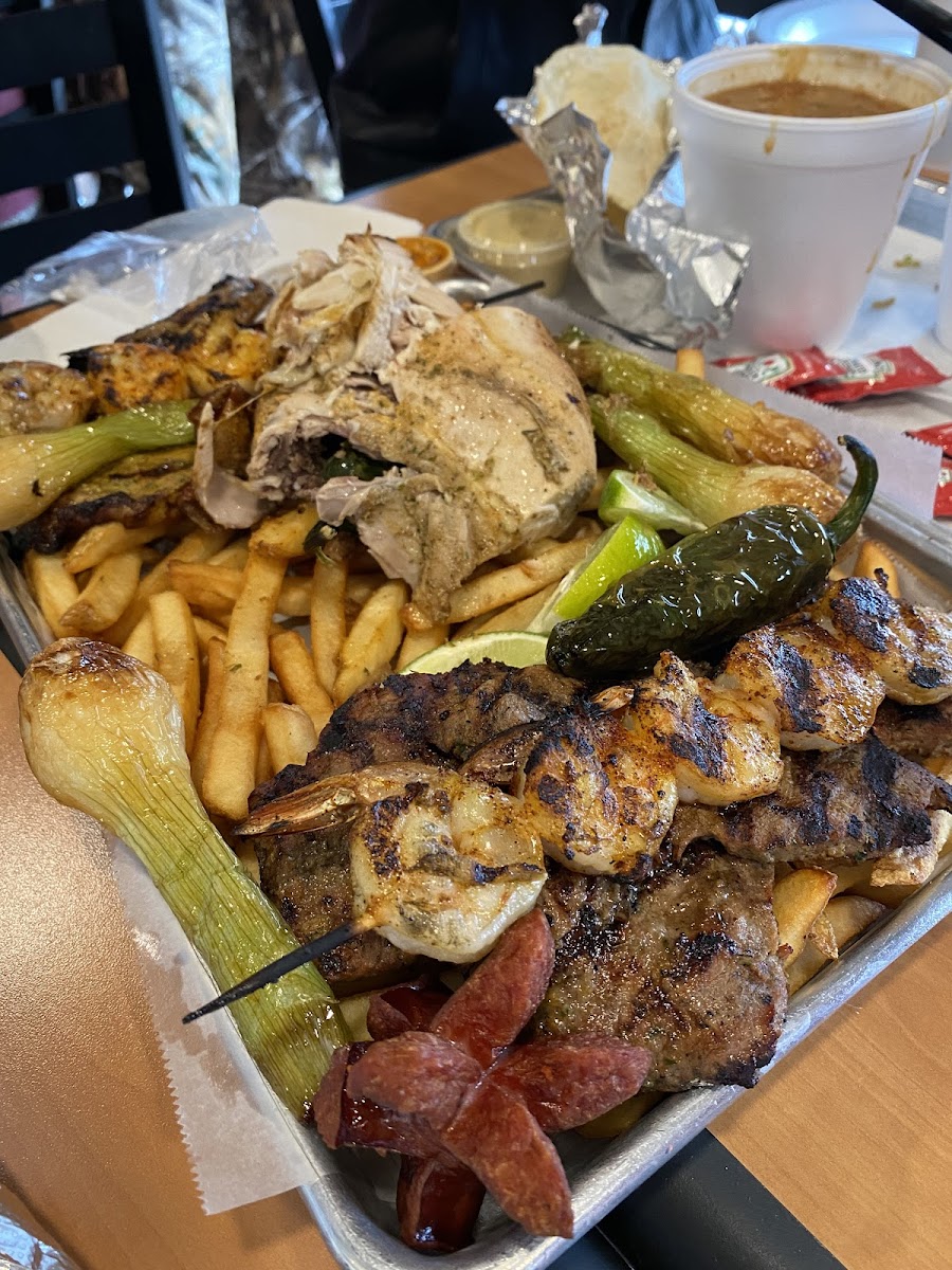 The picture is after we were done eating, sorry I couldn’t wait I was starving! I ordered take out around 12:30 on a Monday afternoon and it was empty and service was quick. There was plenty leftover as you can see and my 2 kids 7 and 6 years old also ate and enjoyed the meat flavors but they eat so little so more for me and my husband lol. I would say this could feed 2-4 people depending on how much they eat. Maybe 3 full grown adults or probably 2 adults and 2-3 small children. Plantains were AMAZING and the fried rice and charros beans were the 3 sides we chose with our parrillada meal. They weren’t stingy with the portions there was lots of carne asada, chicken and pork in our tray. Shrimp was very tasty my son liked it. I love that it comes with corn tortillas, roasted jalapeño chiles and roasted green onion bulb inside so I can make tacos. Warning the small red salsa is very spicy but also very delicious. The meal had bold flavors and was very satisfying. Everything was seasoned well and had moisture, no dry meats here. I love it! I plan to come back with my family. The meal cost around $54 with tax included and plus tip your looking around close to $60 but well worth it for a solid authentic family meal.