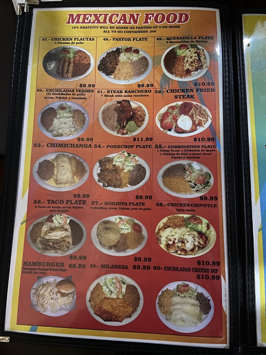 Excellent tasting food. Flour tortillas well made and cook to perfection. Menu has a large selection of food and plates, from steaks to tacos to sea food and appetizers.