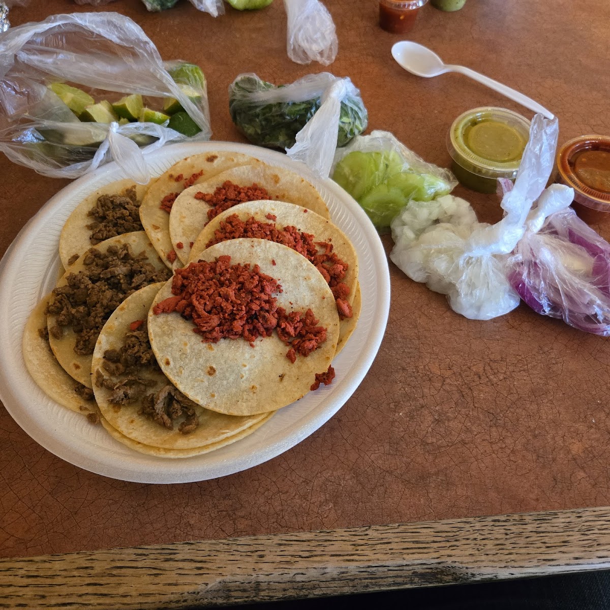 I am giving this place 5 stars. You want inexpensive, good tacos fast - this is a great place, not fancy. They give you the basic taco - al pastor or beef - and the fixin's as sides. You build them how you like them. The sides were all very fresh. Service was quick. You buy packs of tacos. I think the smallest number is 4. They are not big. 4 is a good number for 1 person.
