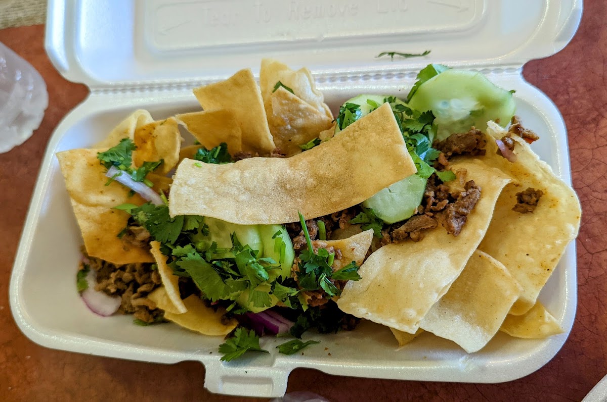 This is an ideal place for take out orders. You order at the counter as you walk in if you want to stay. Didn't like the fact that the food was all in bags even though I was eating in (thawed veggies) presentation is definitely lacking but makes sense because they don't serve you. The best part were the chips for me. The tacos seemed to have random ingredients included (would've preferred some cabbage or lettuce) it had two types of onions, cilantro, cucumbers?, limes, and some sauce.