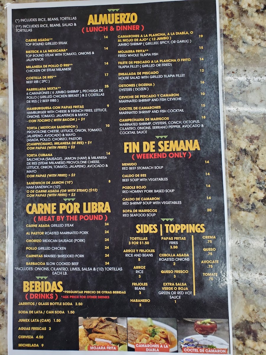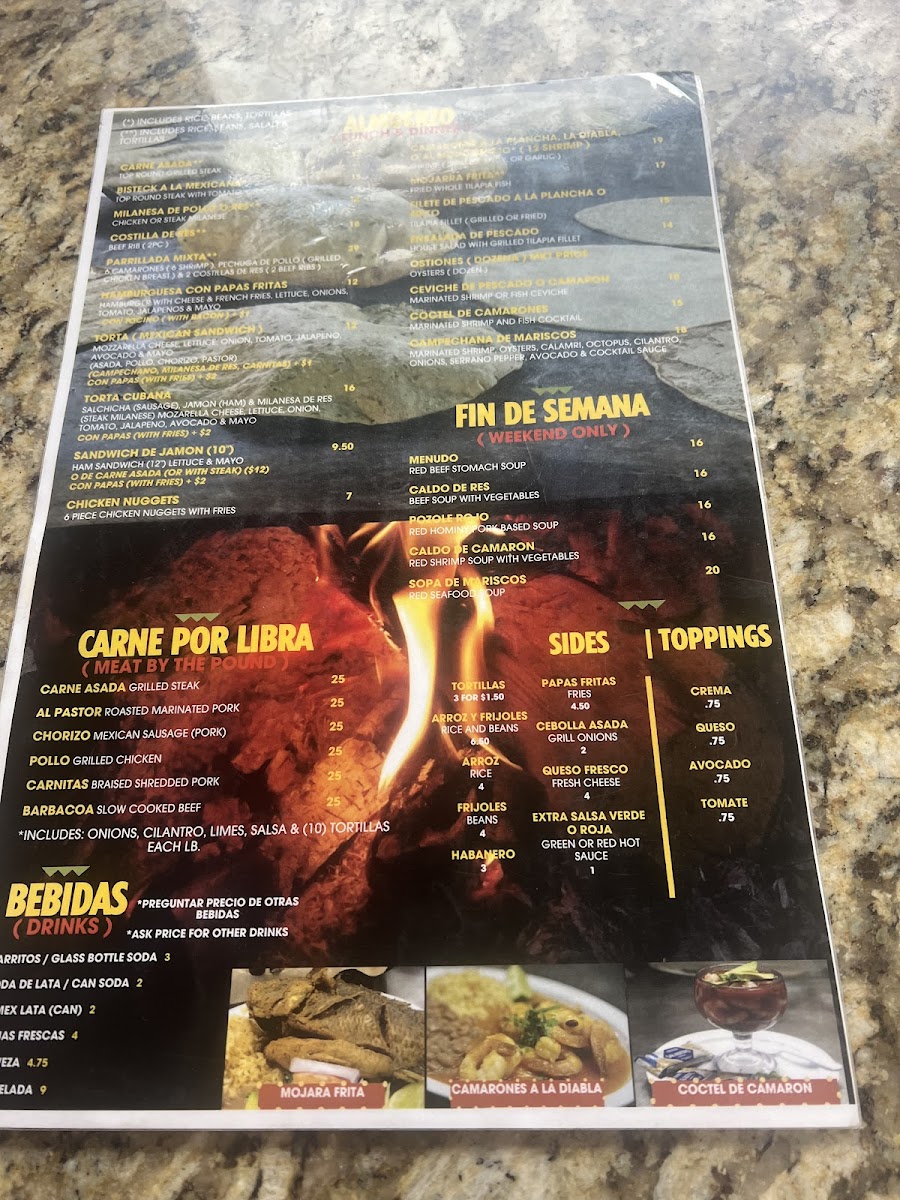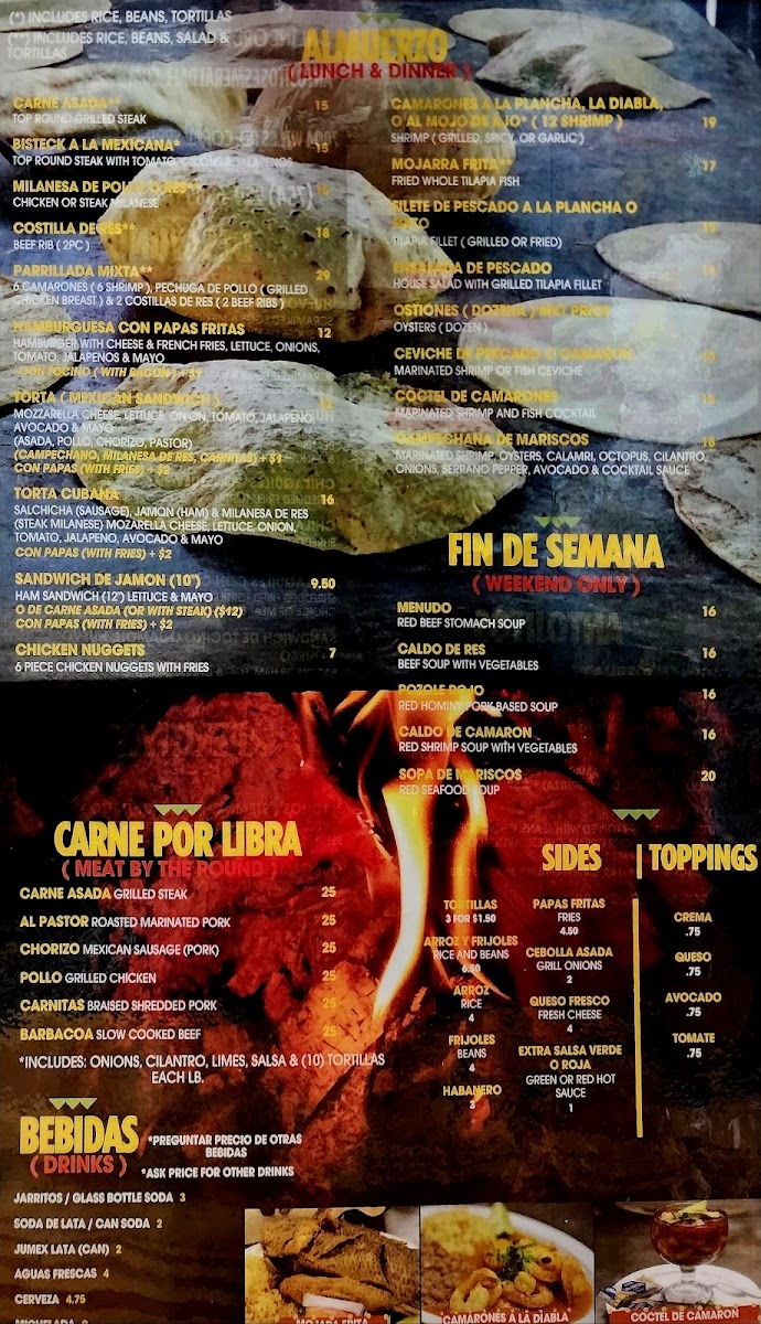 Camarones jumbo (6 jumbo shrimp), pechuga de pollo (grilled chicken breast), & 2 costillas de res (2 short ribs).