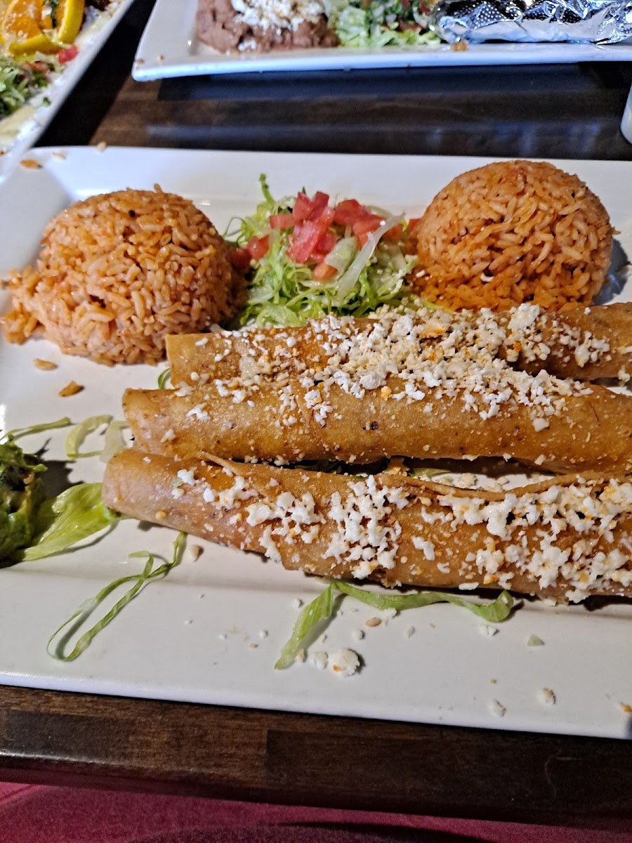 The food was delicious very favorable but I ordered the 3 meat fajitas chicken, steak and shrimp as you see in the pictures where is the steak. Now the Flautas was great my first time having it. The refried beans and rice was real good and favorable. The drinks was ok but I love the Atmosphere and the service was wonderful.