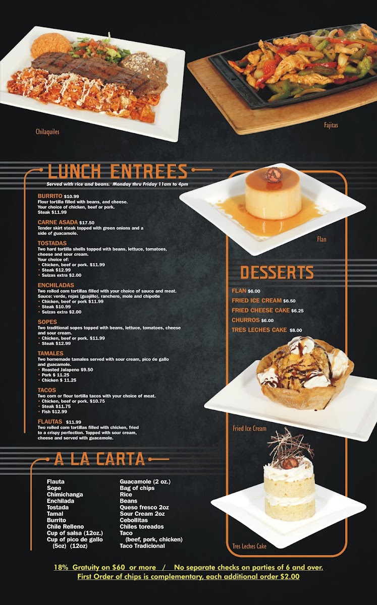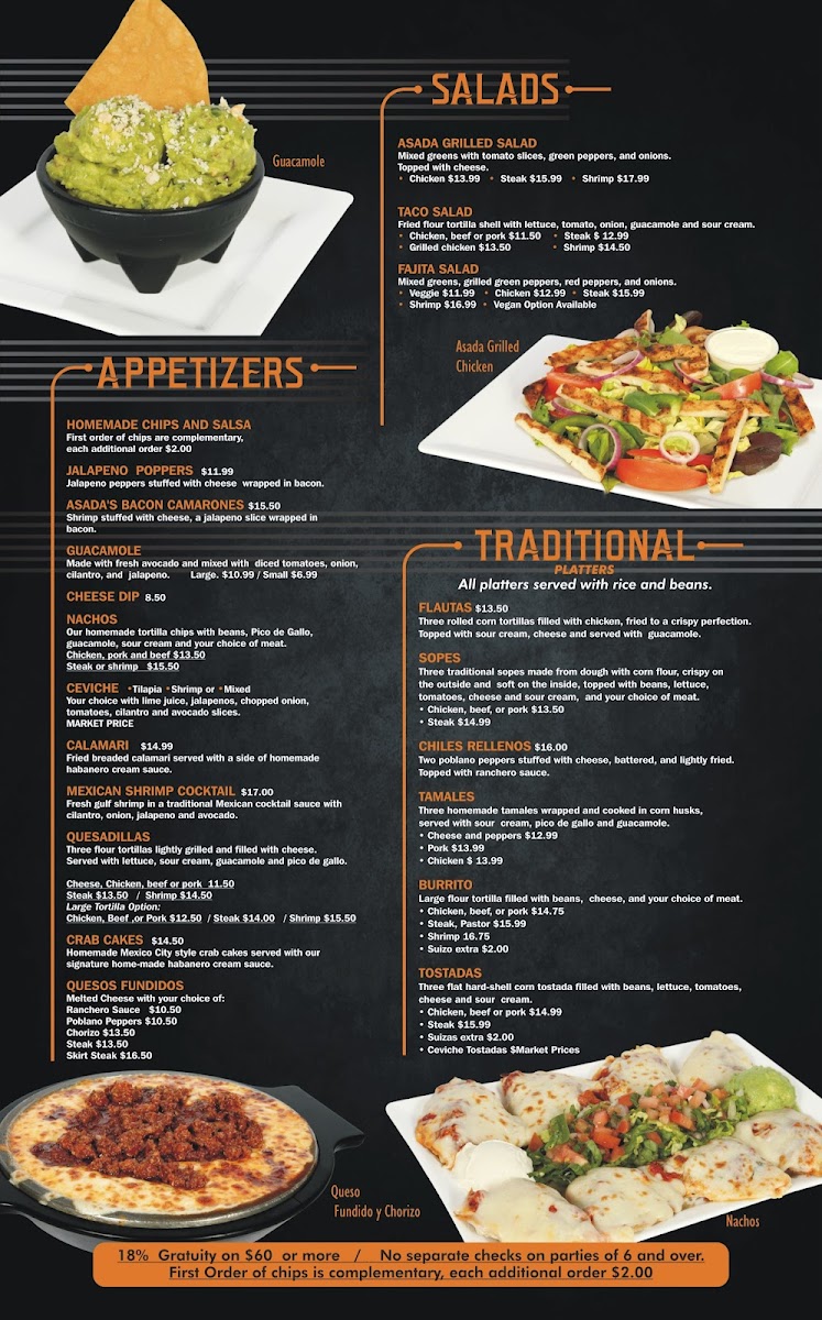 Authentic charbroiled skirt steak topped with ranchero sauce and chihuahua cheese served with lettuce, guacamole and pico de gallo