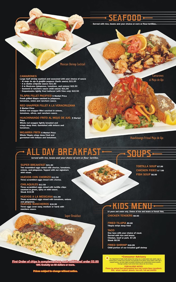 Fresh grilled tilapia sautéed in jalapenos, tomatoes, onion and ranchero sauce.