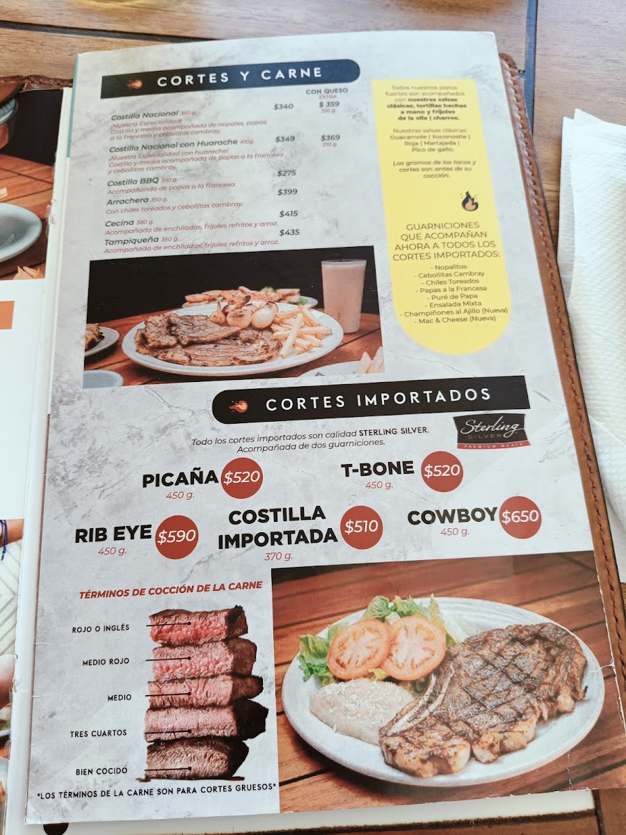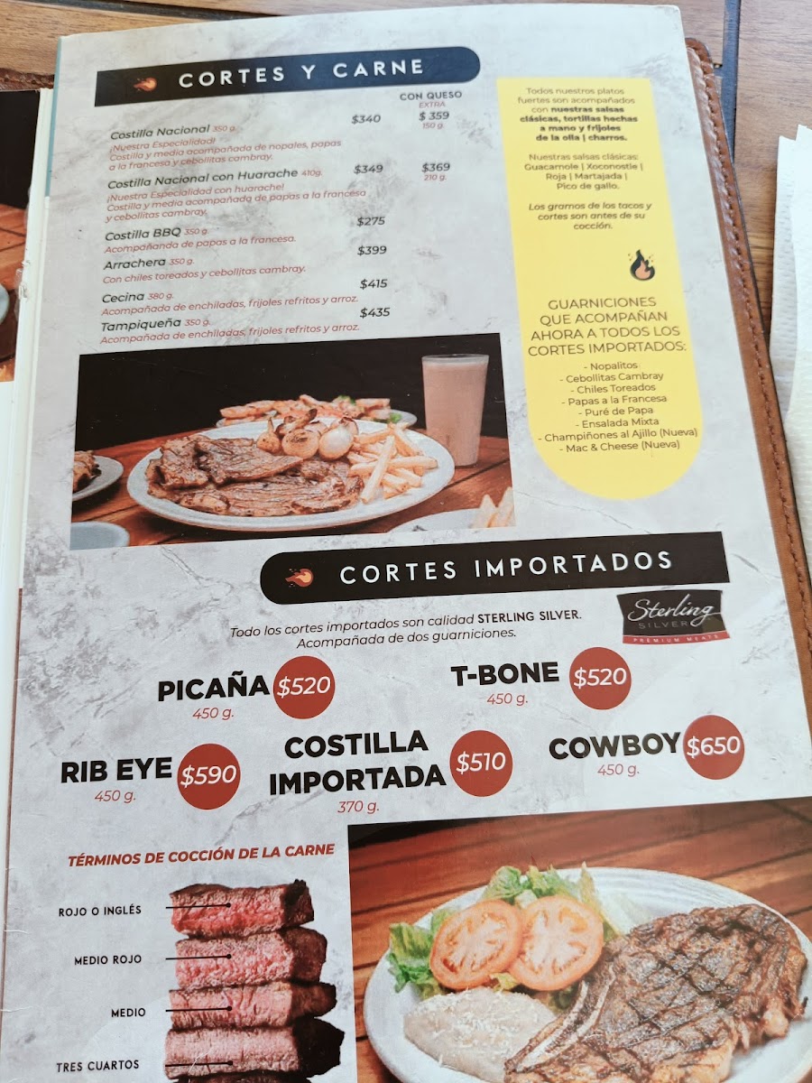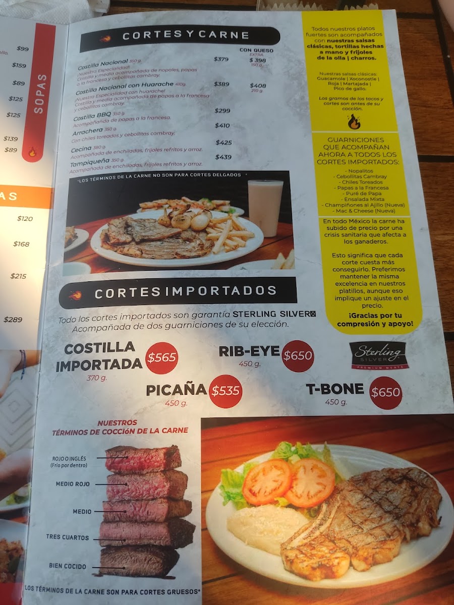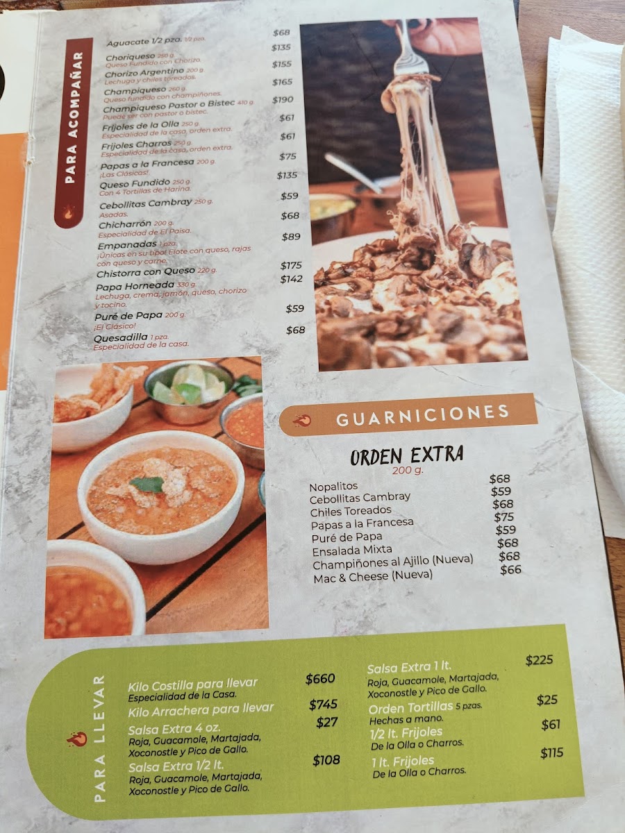 Costilla (350 grs.) sobre huarache (210 grs.) y queso derretido encima (150 grs.). + Refresco